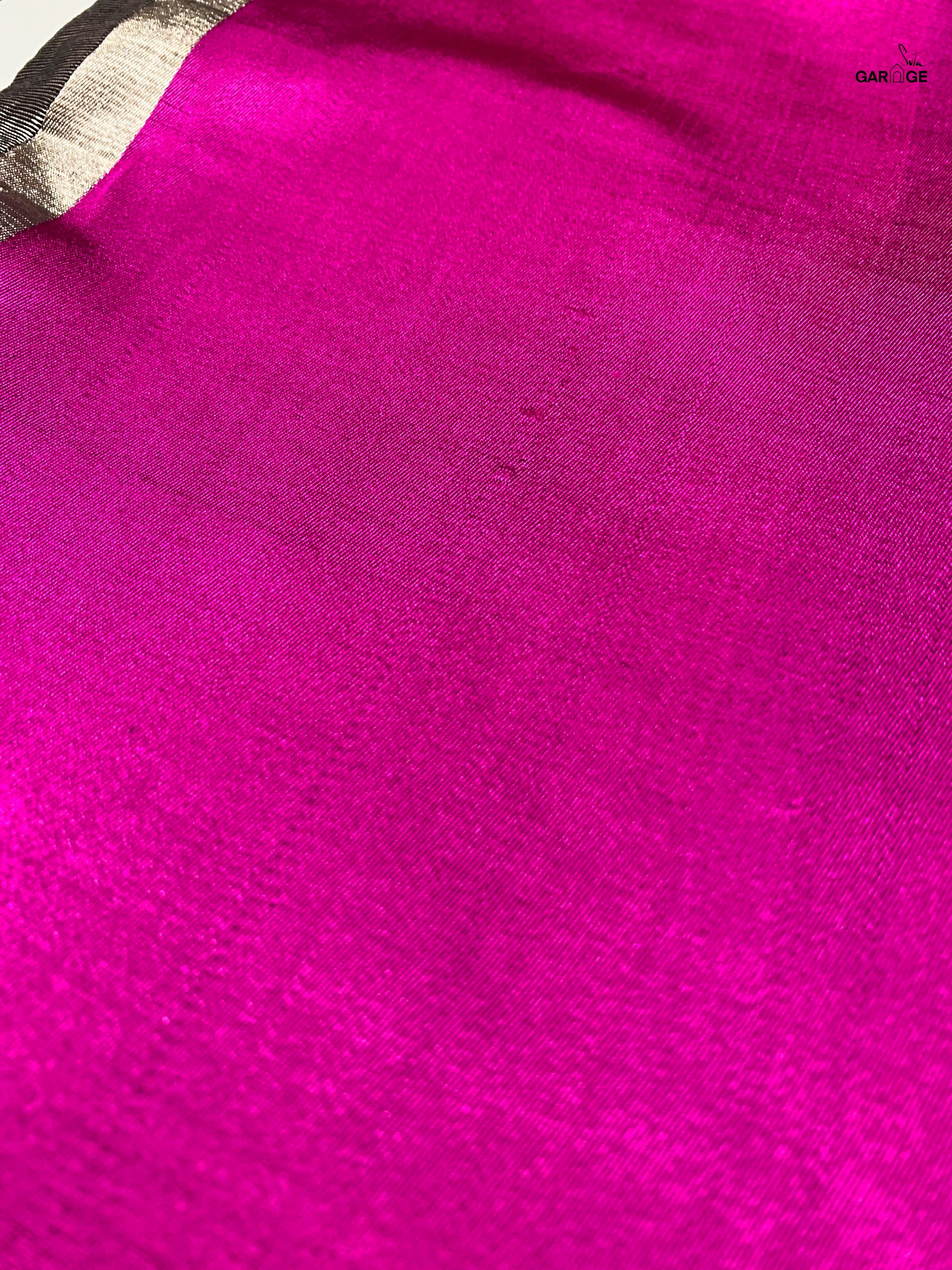 This saree has been handwoven by a master weaver in the Mashru tradition. The Mashru weave is said to have originated in West Asia, in the 19th Century. The fabric is woven with a silk weft and a fine cotton warp. It thus combines the ageless comfort of cotton and the timeless aesthetic of silk, elevated by the presence of gold and silver zari.