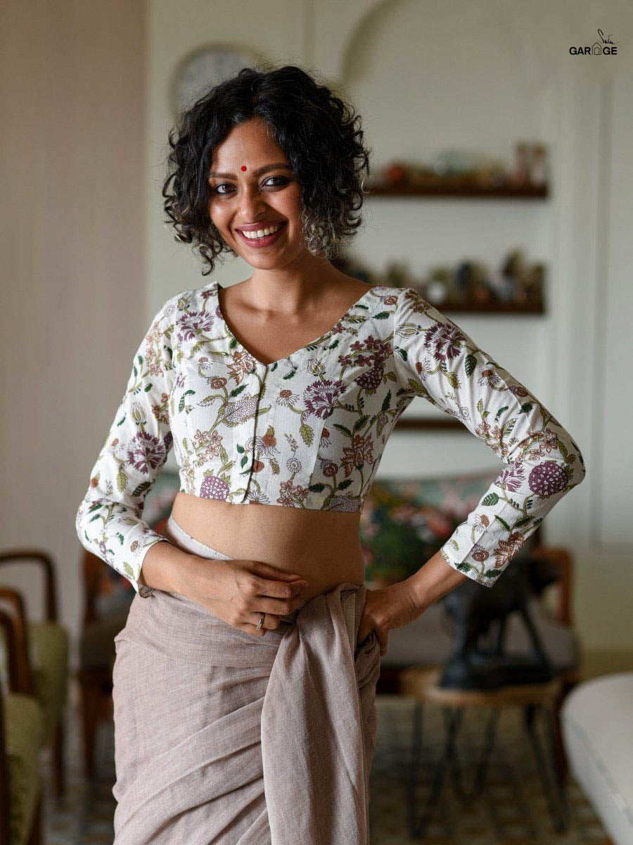 The model is wearing size S blouse and saree is Cinnamon Dust