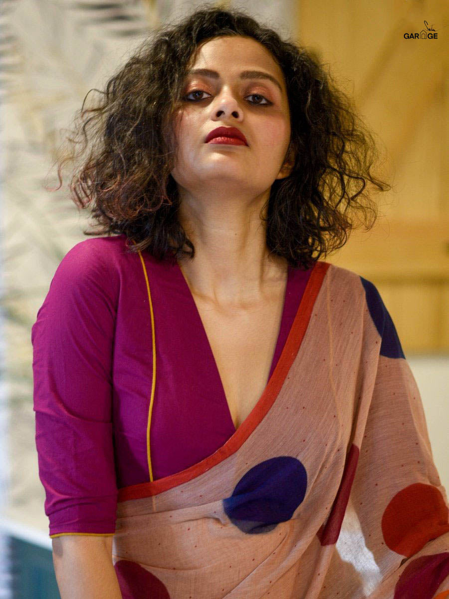 Su, the model is wearing size S blouse and the saree is Rainbow in my Glass Jar Polka: