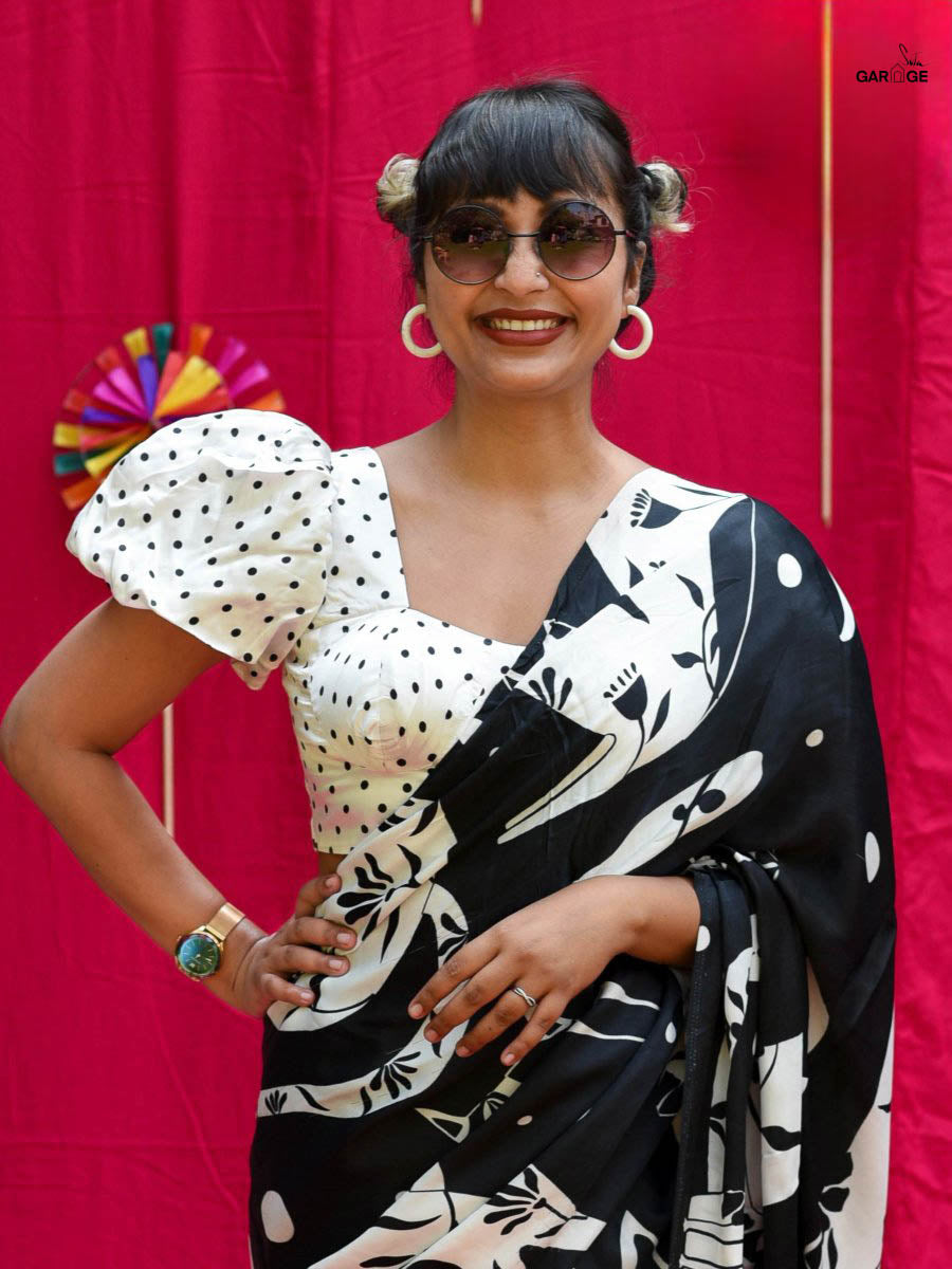 Ta, the model is wearing sizes blouse and saree is Meow Wow