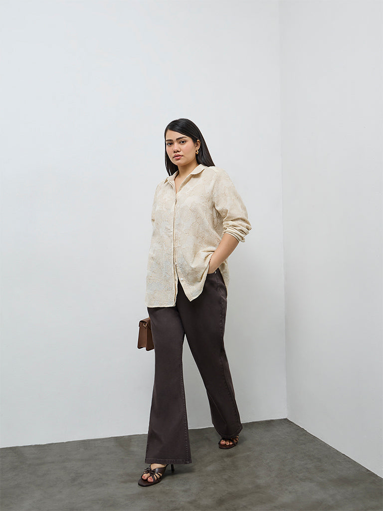 Float through off-duty moments in this beige shirt from Gia, adorned with subtle floral embroidery that adds quiet charm. Made from a breathable fabric, it’s styled with a collar flowing into a concealed button placket and full sleeves, delivering a polished silhouette perfect for weekend outings or travel days.