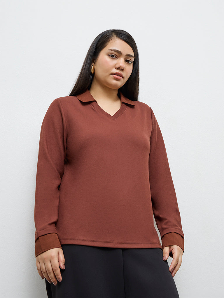 Gia introduces this brown t-shirt to add a polished appeal to everyday dressing. Crafted from a soft, lightweight fabric, it is finished with a ribbed texture that drapes comfortably on the frame. A collared is paired with full sleeves, keeping the look clean and understated.