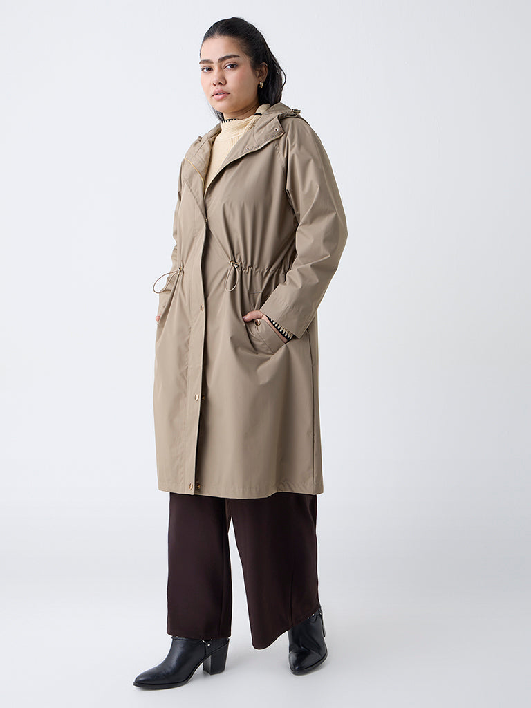 Step out feeling warm and confident in this khaki long coat from Gia. The drawstring hood and concealed full zip keep you protected from the chill, balanced by a golden metallic button placket for a refined finish. An elasticated waistline shapes the silhouette, while pockets add practical ease.