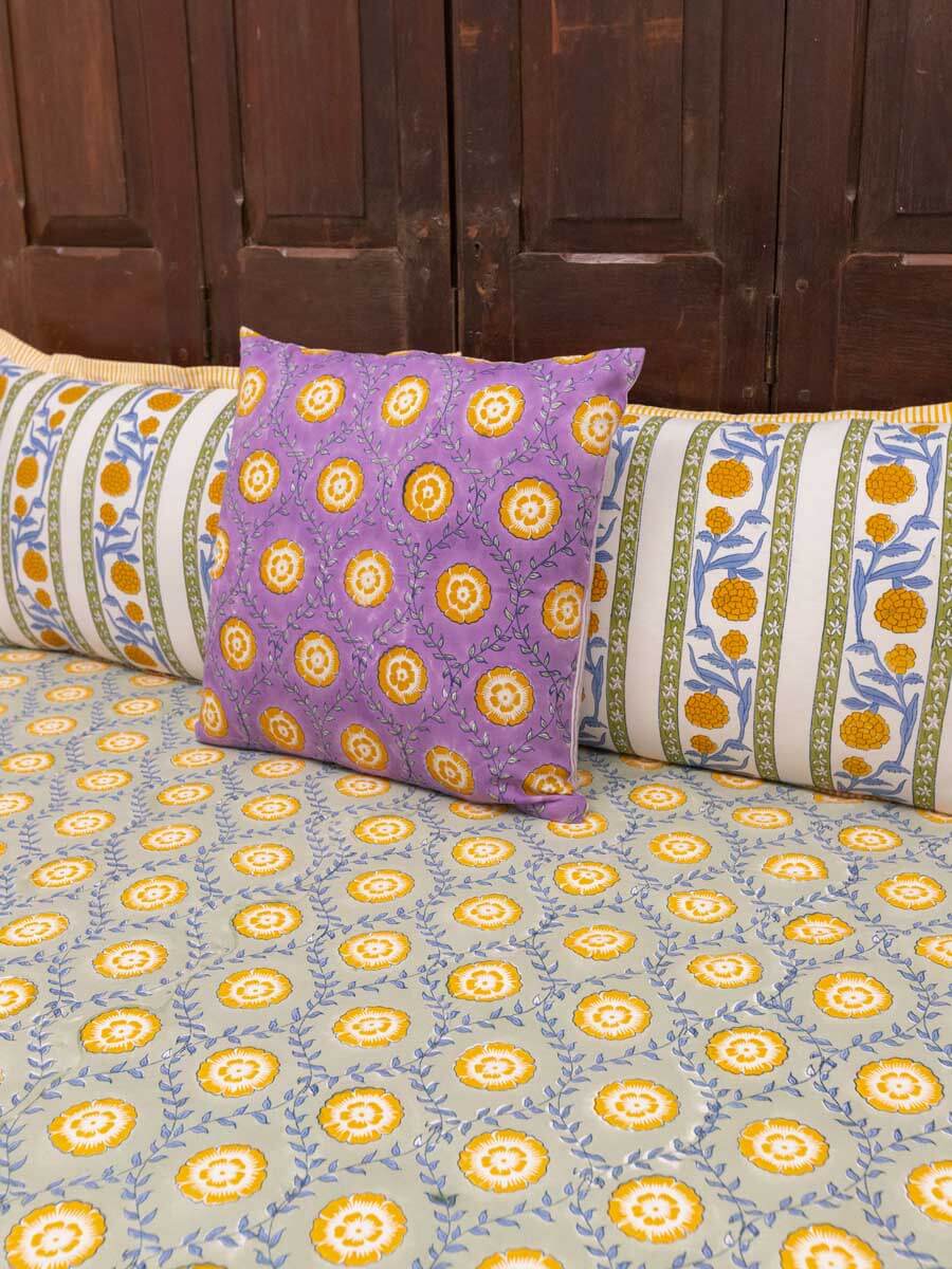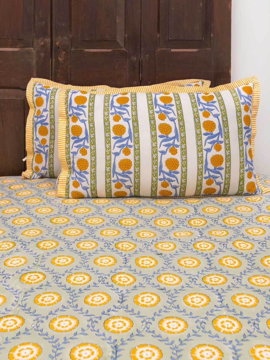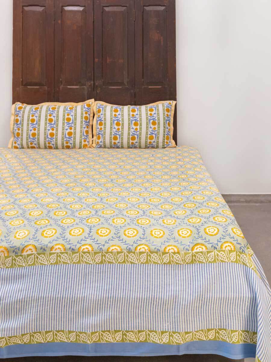 Golden Bloom Hand Block Printed Cotton Bed Sheet
