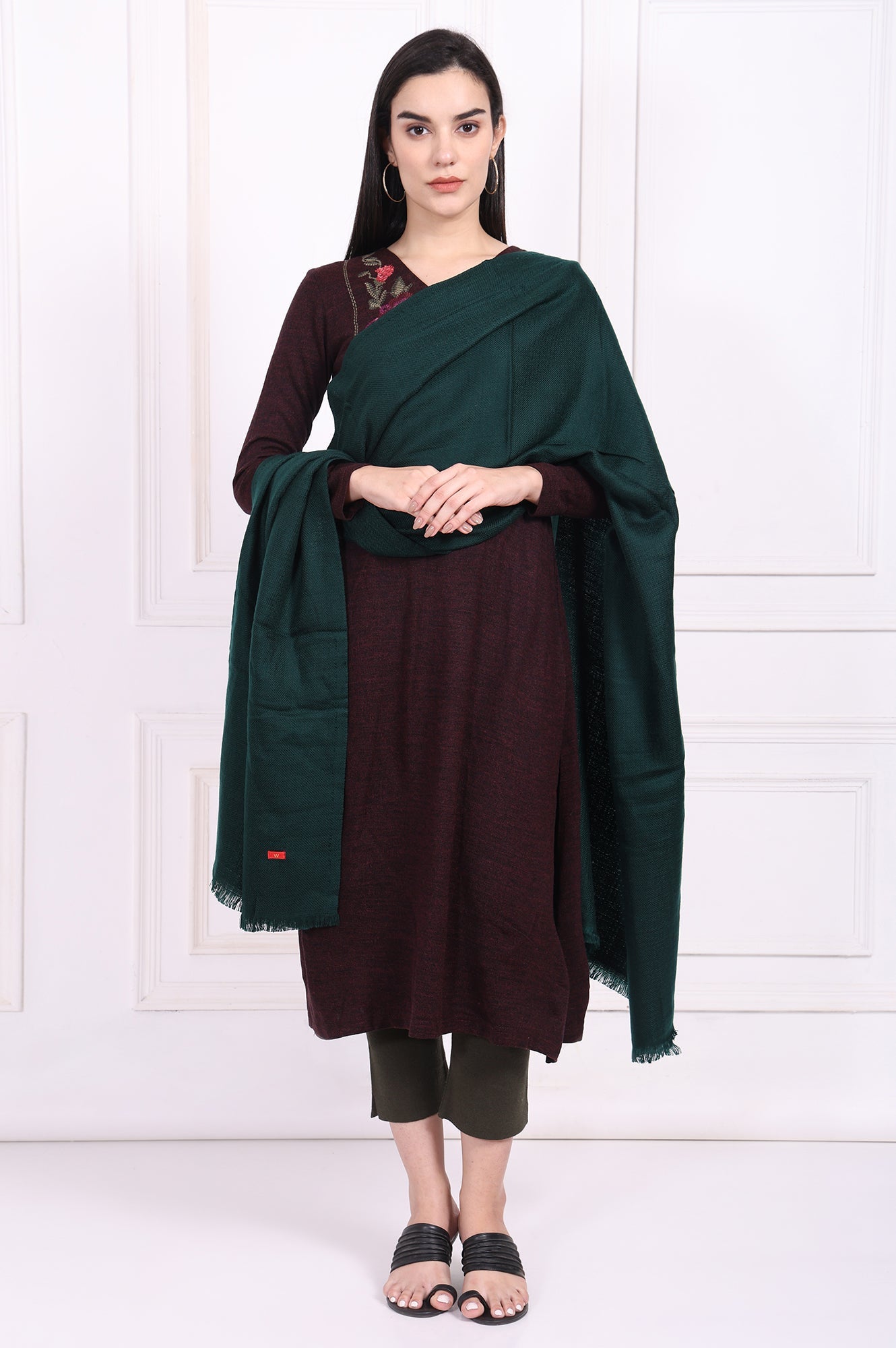A whisper of winter warmth, this gorgeous designer stole is destined to become your go-to accessory. Crafted in a rich, verdant hue that evokes deep forests, this solid-colored shawl for women offers unparalleled versatility for your wardrobe. The finely woven acrylic fabric feels incredibly soft and warm against the skin, promising cozy comfort on the most brisk days and evenings. Measuring a generous 2 meters in length and 70 centimeters in width, this ethnic wrap provides ample coverage and drapes beautifully over your shoulders, whether you're styling it with a traditional kurta set or a contemporary Western outfit. Its design is a study in understated elegance, featuring a classic solid body that allows the opulent color to take center stage. The edges of this beautiful scarf-style wrap are finished with a delicate, short fringe, adding a subtle touch of texture and movement to the silhouette without overwhelming the minimalist aesthetic. This completely opaque stole ensures a graceful and modest look, making it an ideal choice for a variety of occasions, from casual day outings to more formal ethnic gatherings. You'll find yourself reaching for this timeless piece again and again, as it’s a perfect fusion of enduring comfort and sophisticated style.