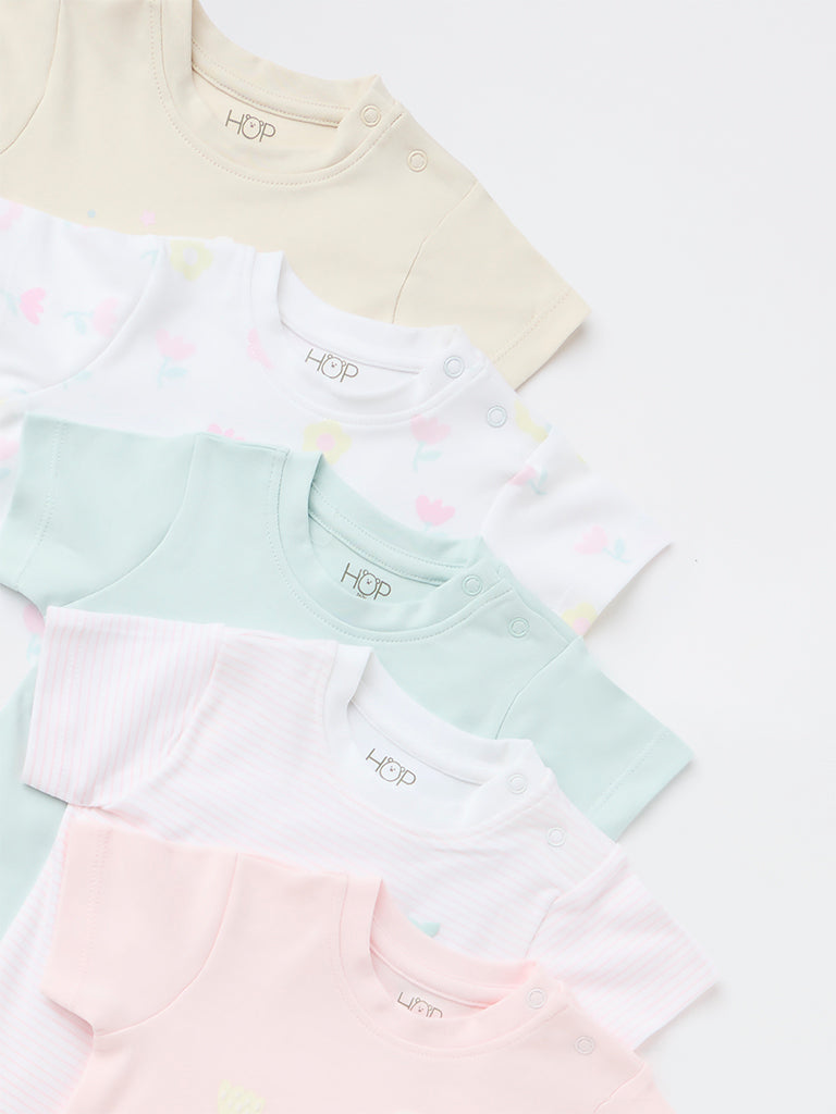 Refresh your little one’s essentials with this HOP Baby five multicolour T shirt set. Crafted from pure cotton fabric, each piece feels gentle on delicate skin and offers snug comfort through the day. Designed in pastel hues with floral prints and striped variants for a girly charm, the multi colour set features a crew neckline and short sleeves for everyday ease.