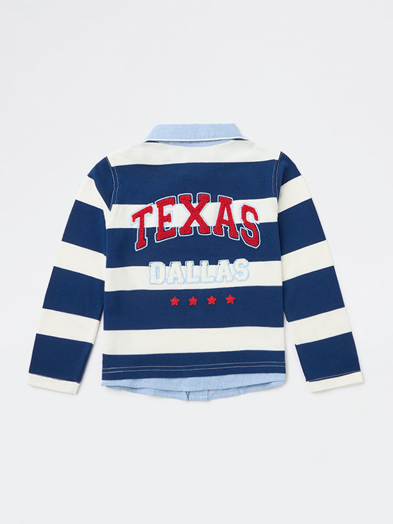Timeless stripes get a dressed-up update in this navy polo tee by HOP Kids. Crafted from a premium fabric, it features a collar, three-button placket, and full sleeves for a sleek silhouette. Subtle logo embroidery at one corner and text embroidery at the back complete the look.