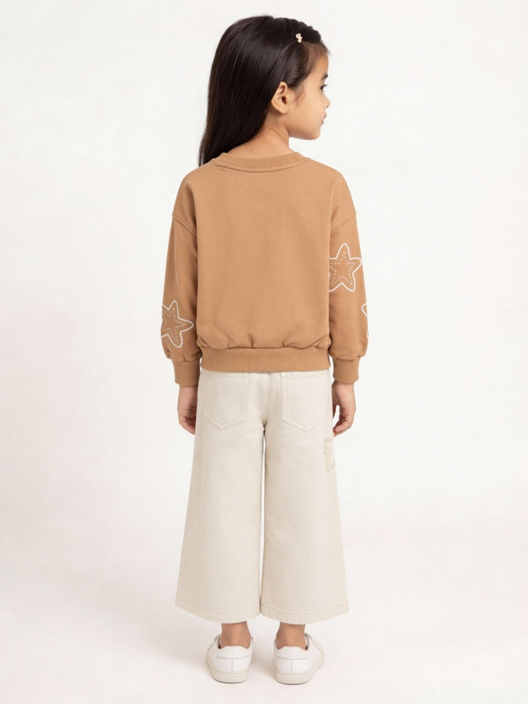 HOP Kids Girls Light Brown Star Design Cotton-Blend Sweatshirt
