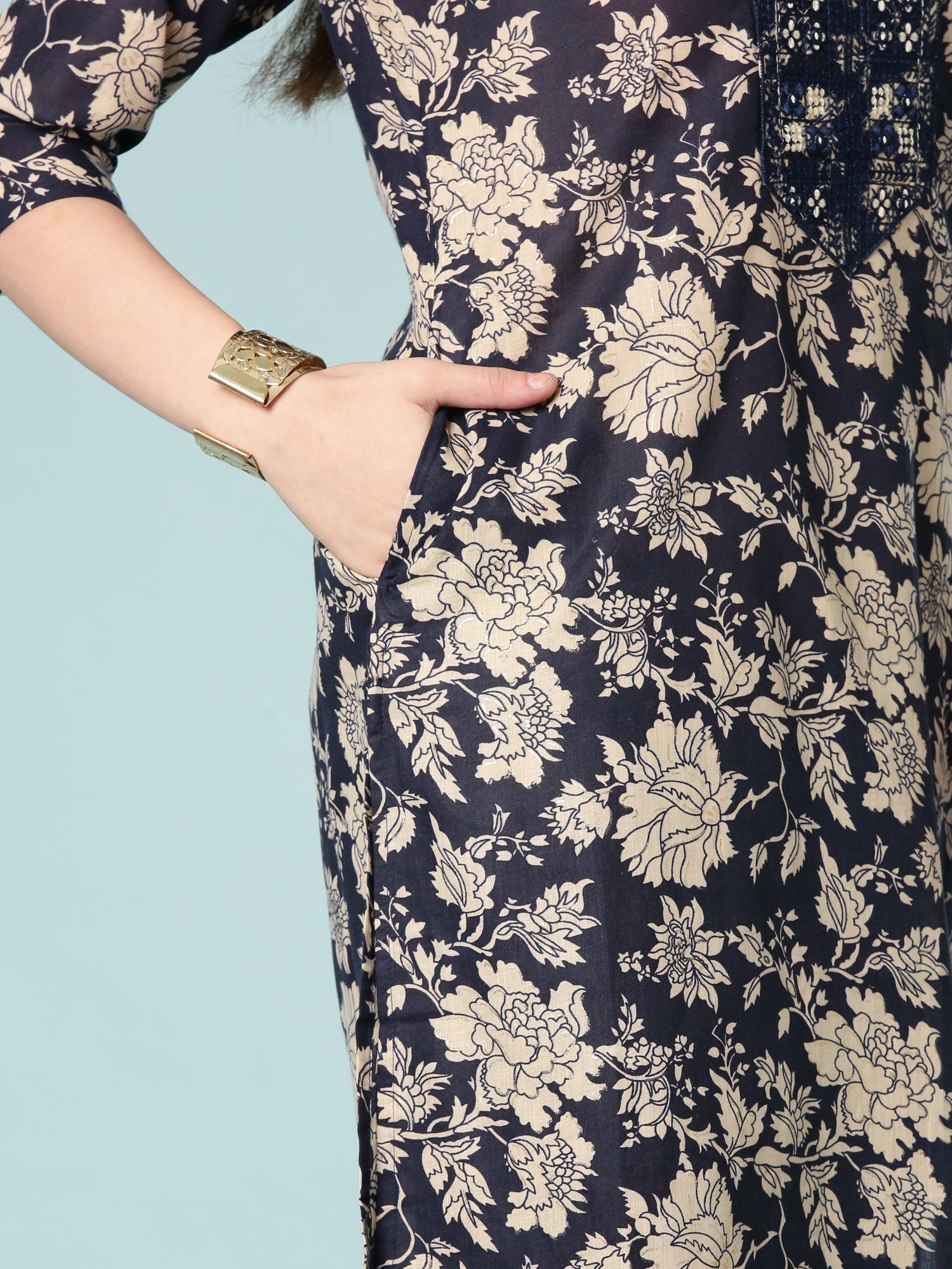 Indigo Blue Modal Silk Floral Digital Print Three Piece Set