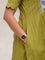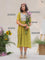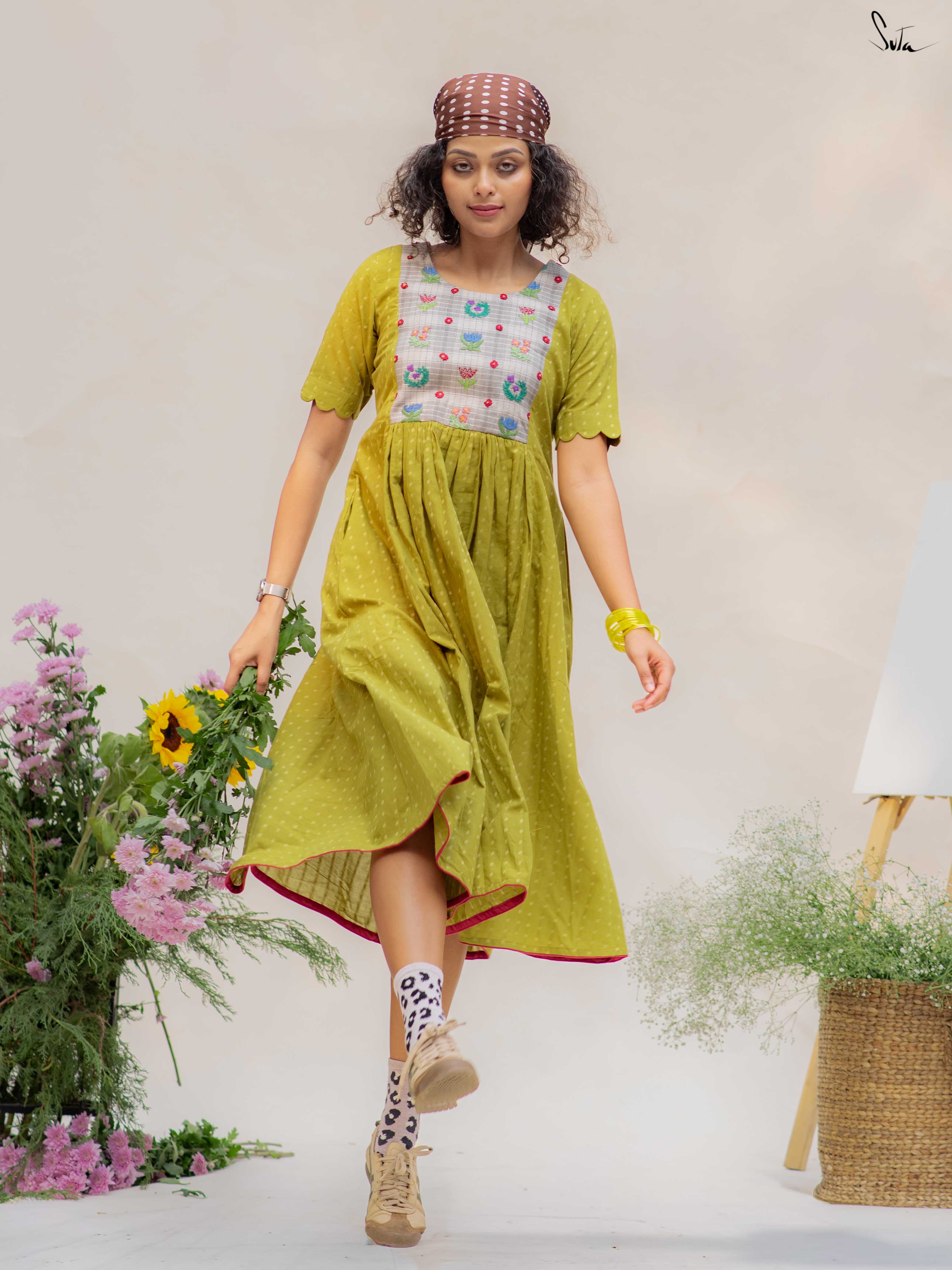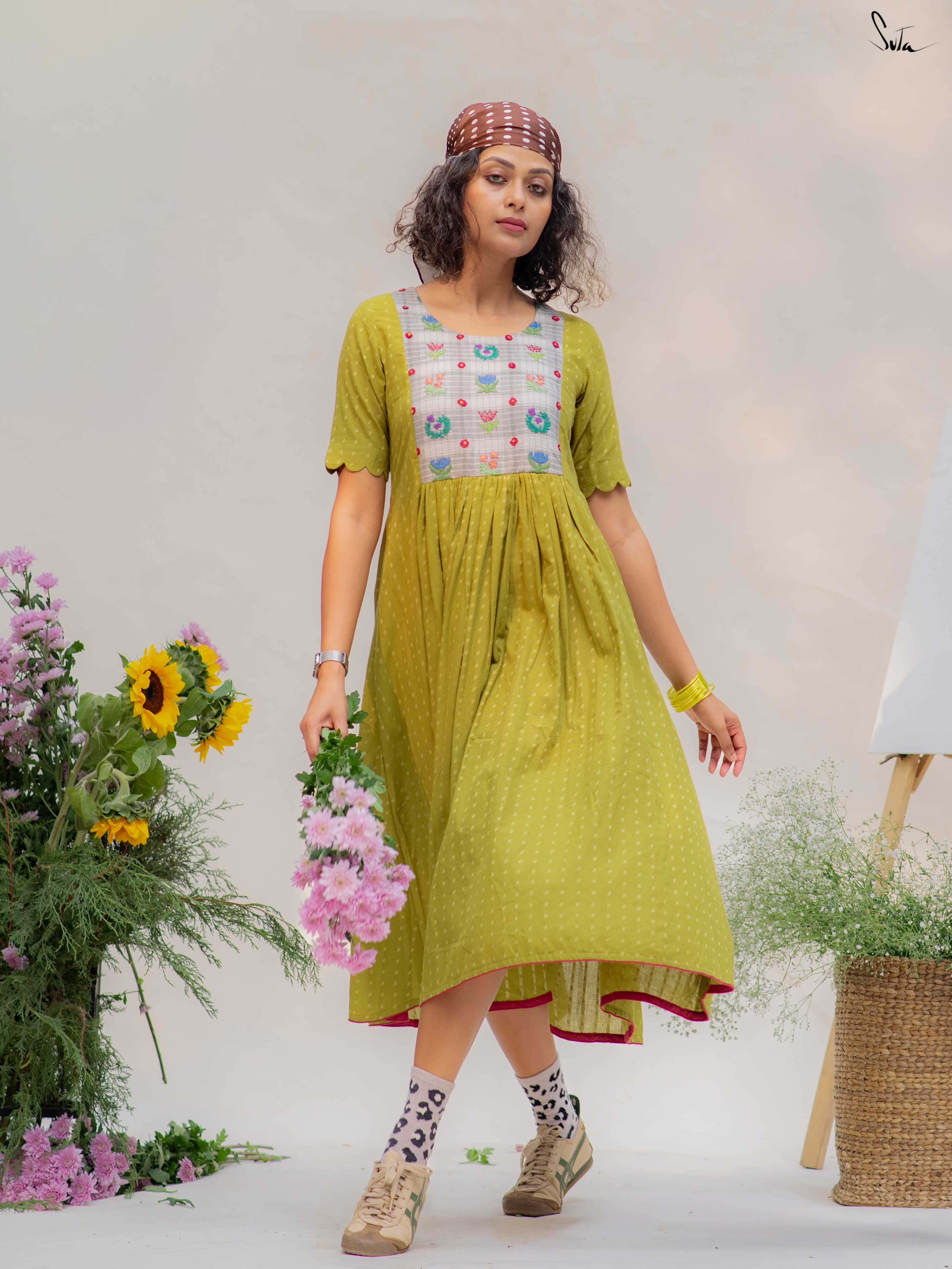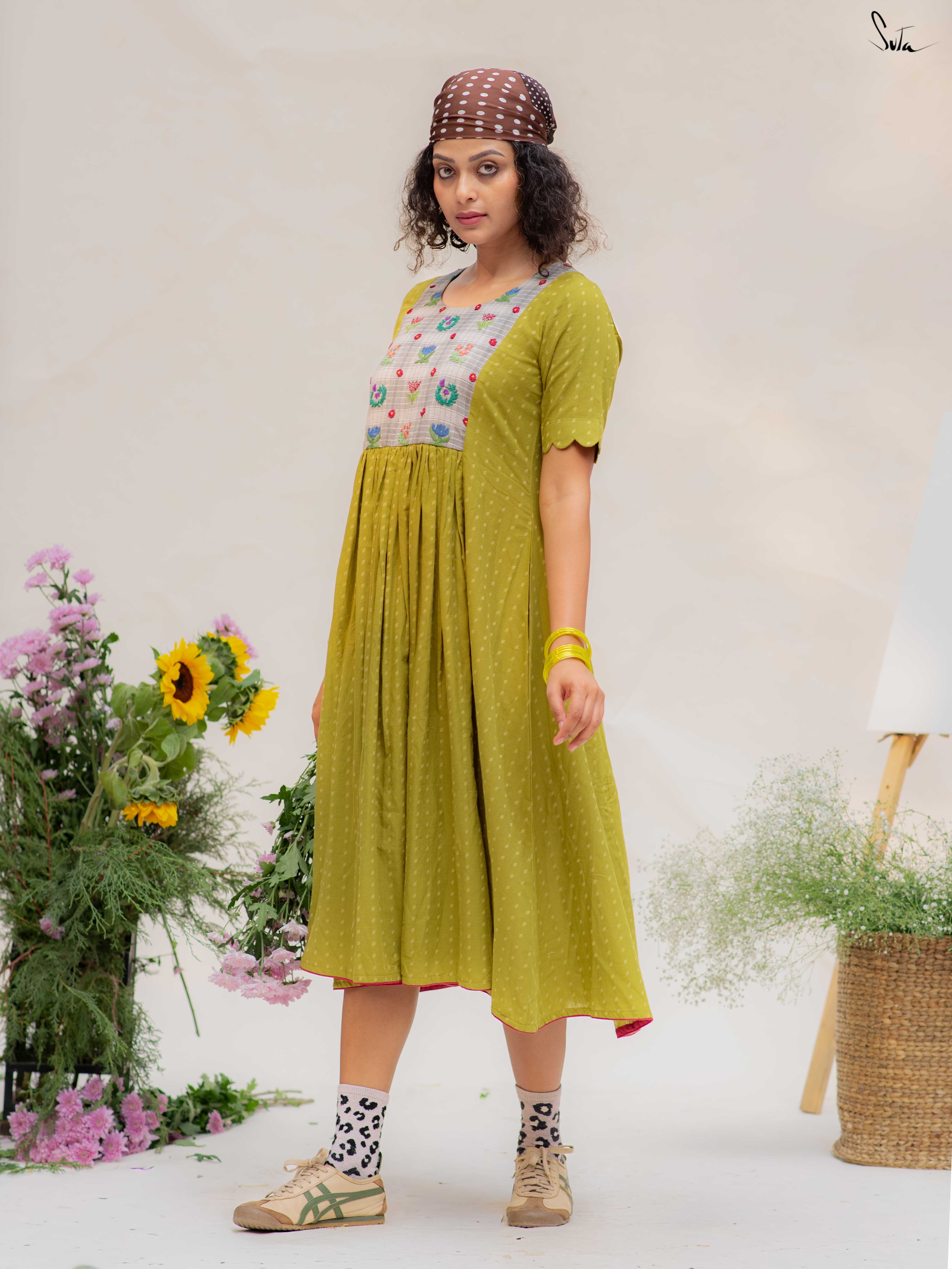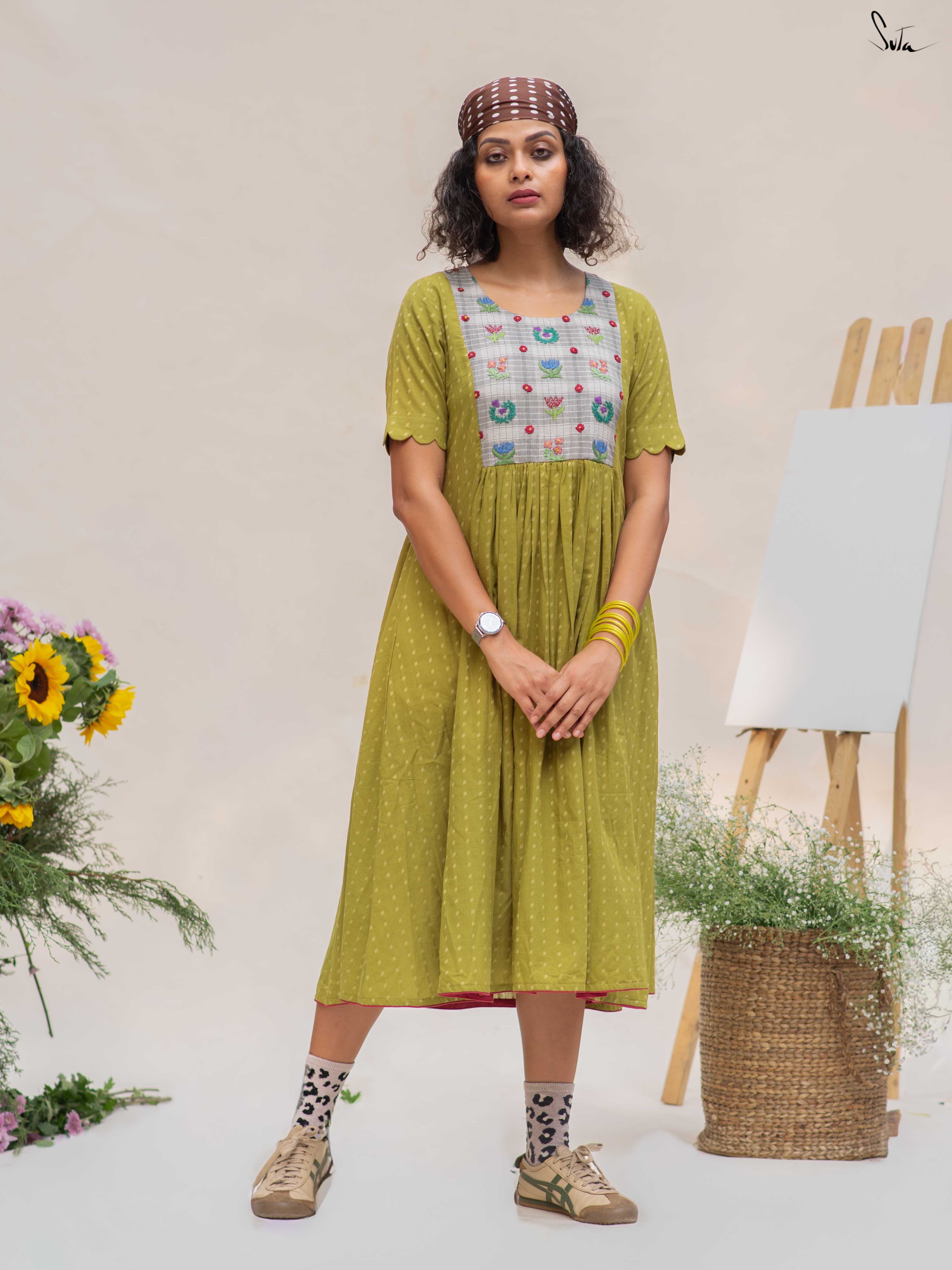 This green cotton dress features a contrast hand-embroidered floral yoke, stitched slowly and thoughtfully. The round neck keeps it timeless, while the short sleeves with scalloped edges add a soft handcrafted touch. Finished with pockets on both sides, it’s made for long, comfortable days.