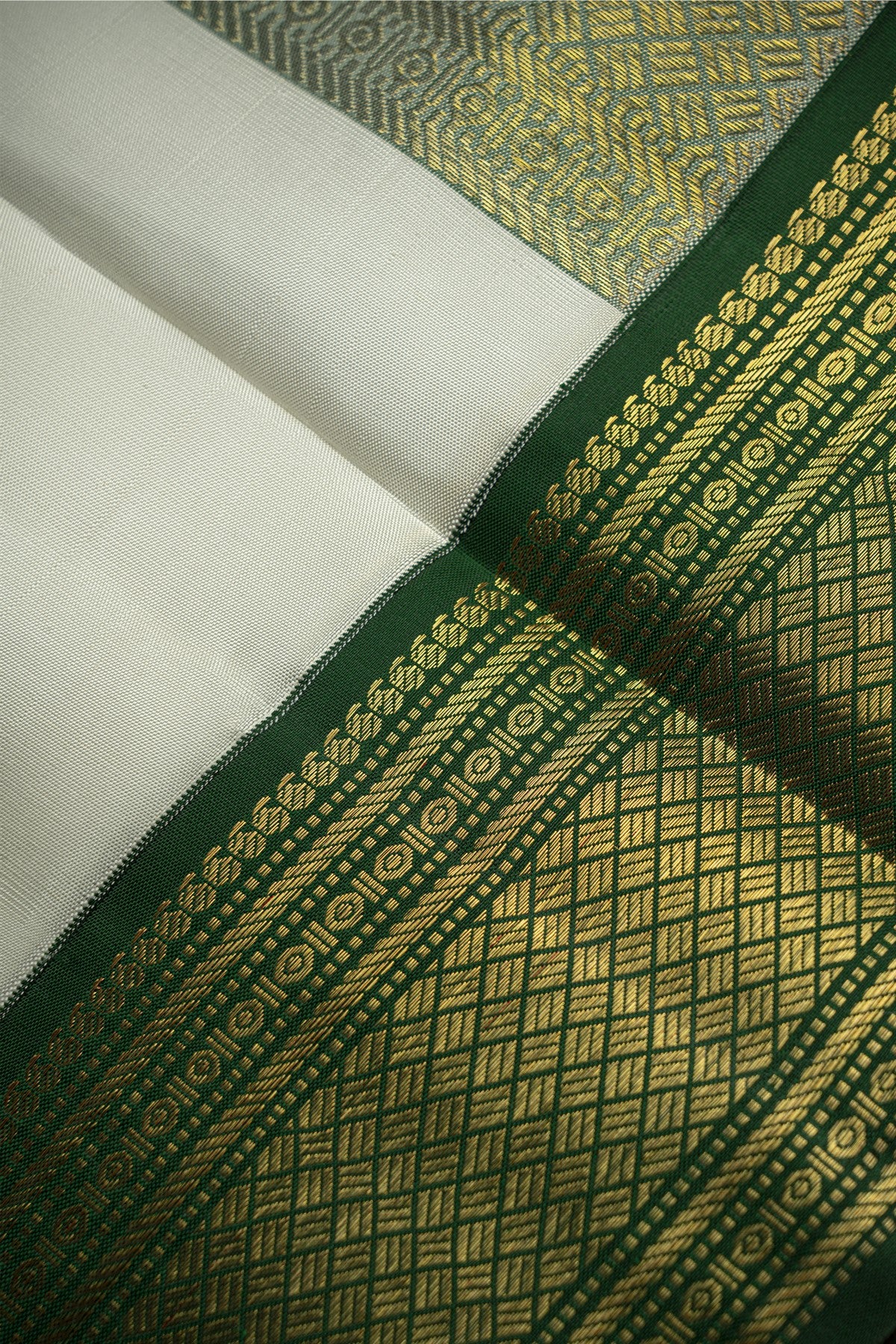 Elegance meets tradition in our Kanchipuram Silk Off White Dhoti, featuring a plain body adorned with florals and diamonds on the contrast border. The classic design and meticulous craftsmanship create a divine ensemble, perfect for weddings and traditional celebrations.