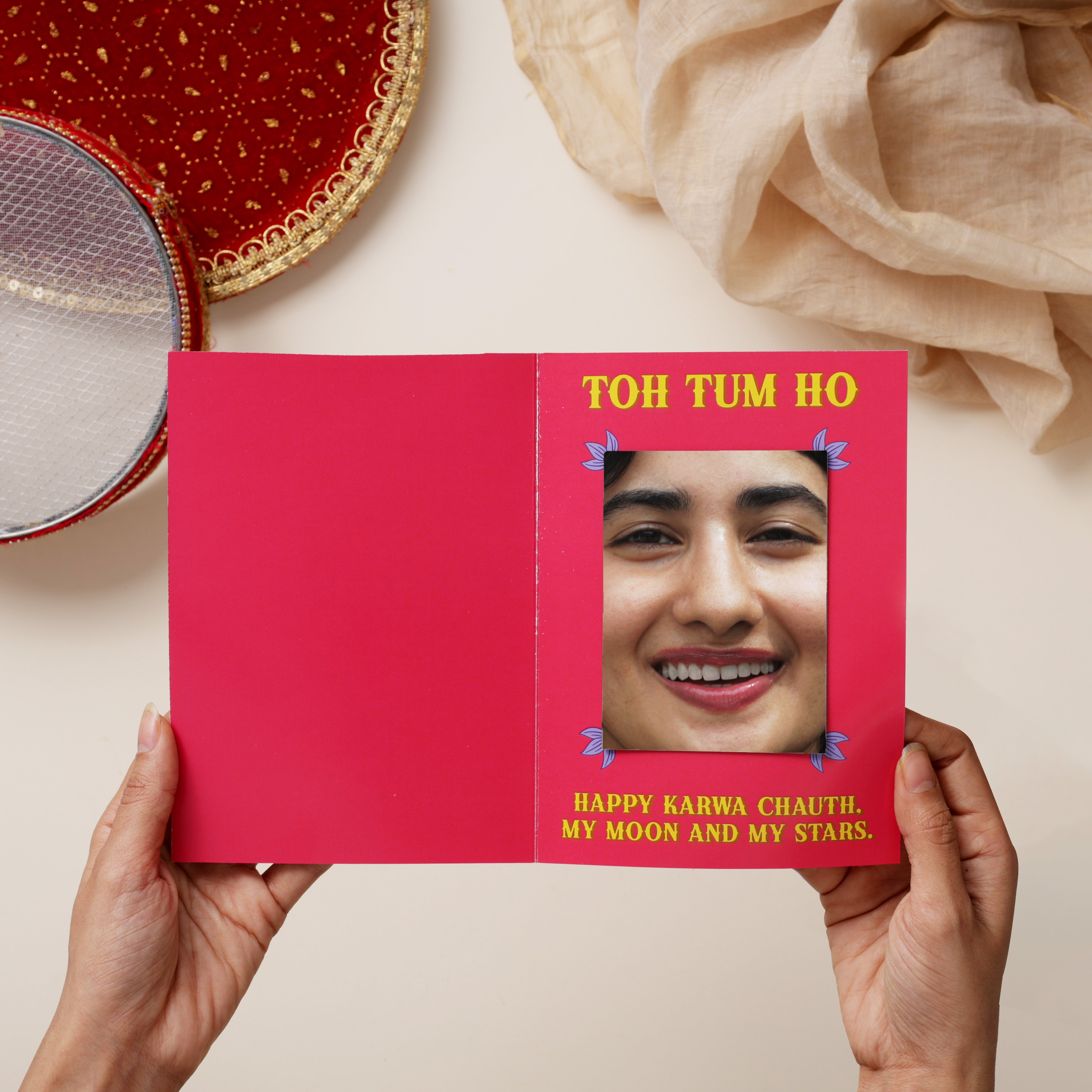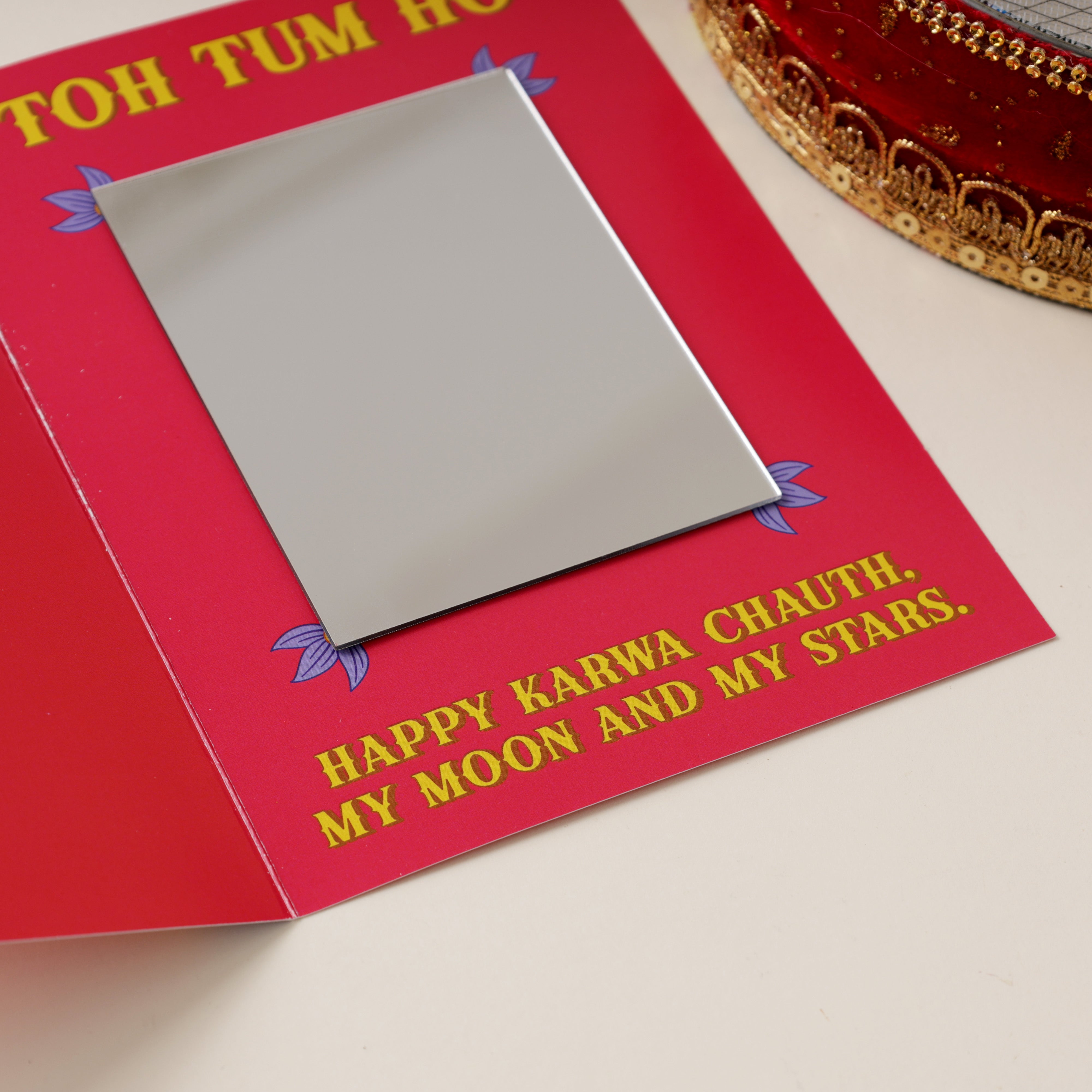 Inside the card (with an attached mirror) says: ‘Toh Tum Ho. Happy Karwa Chauth, my moon and my stars.