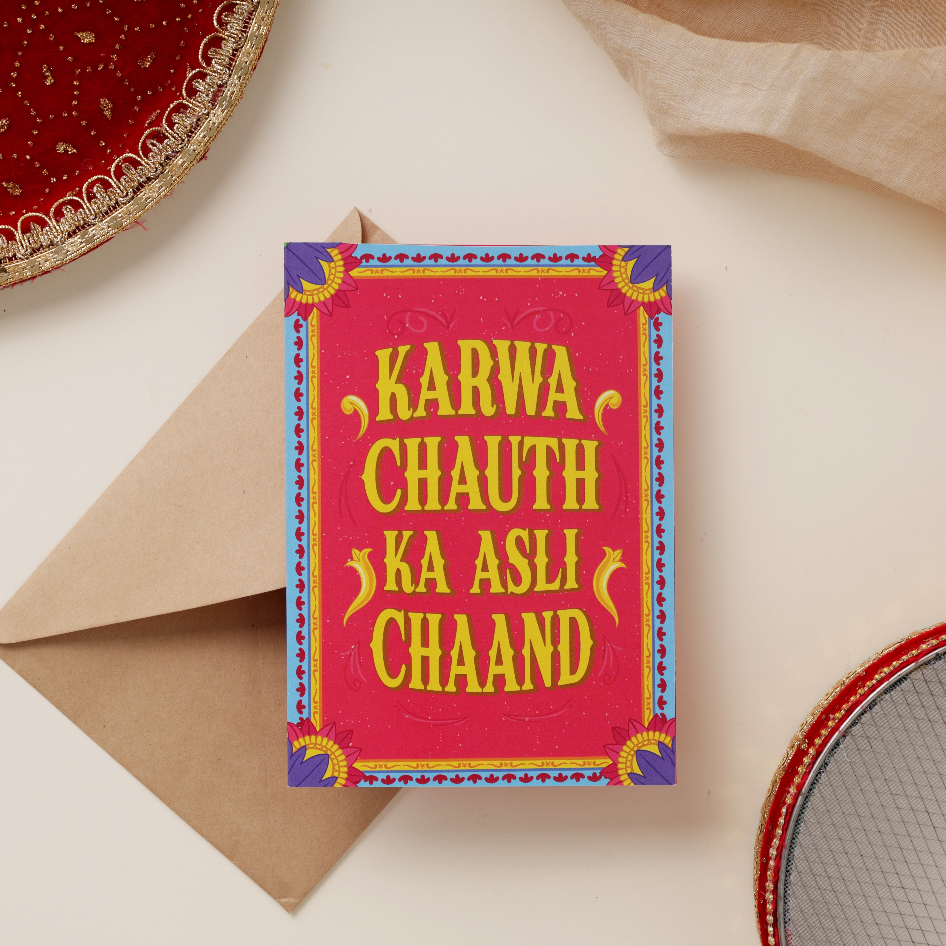 The front of the card says: Karwa Chauth ka Asli Chaand