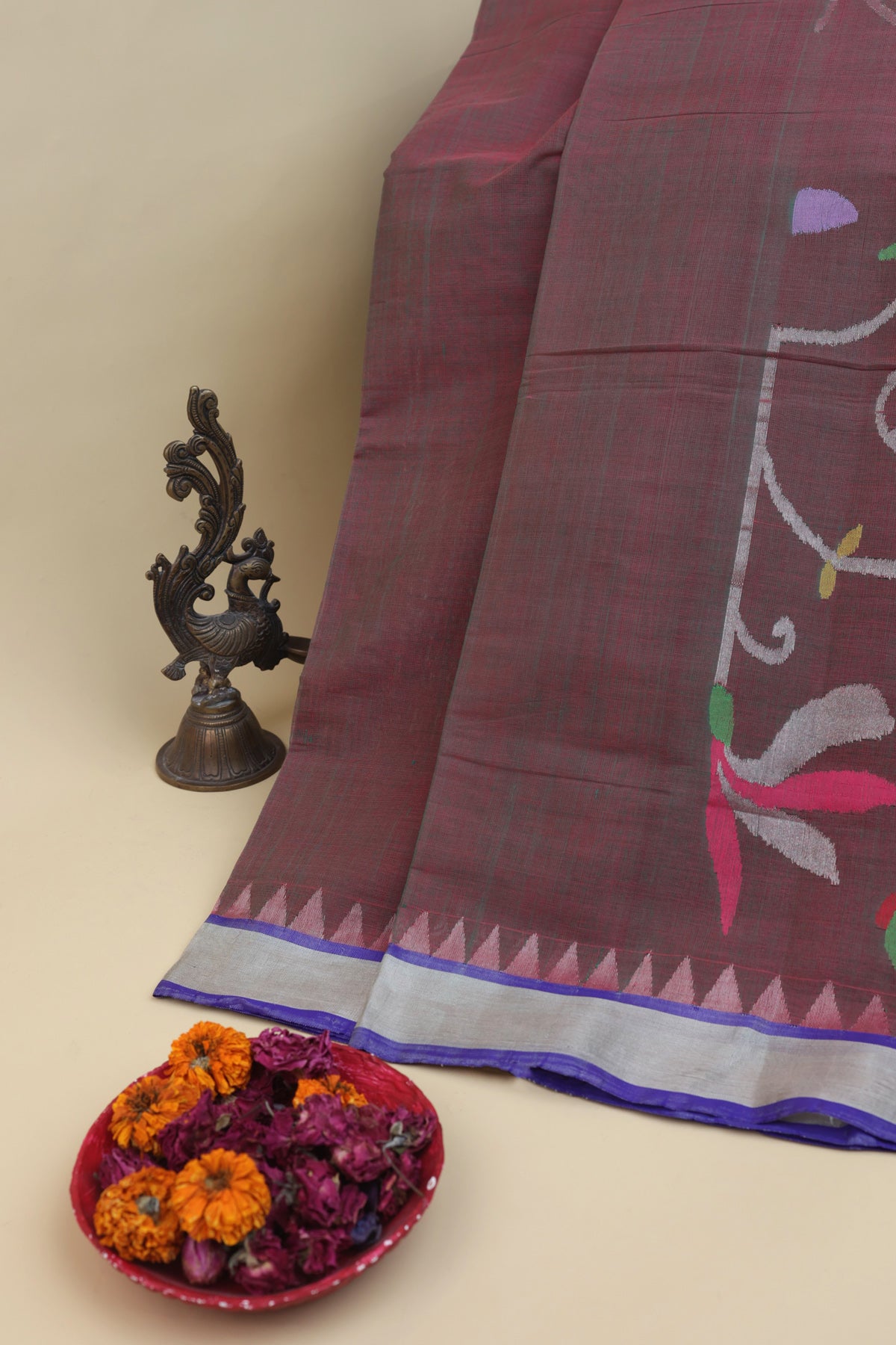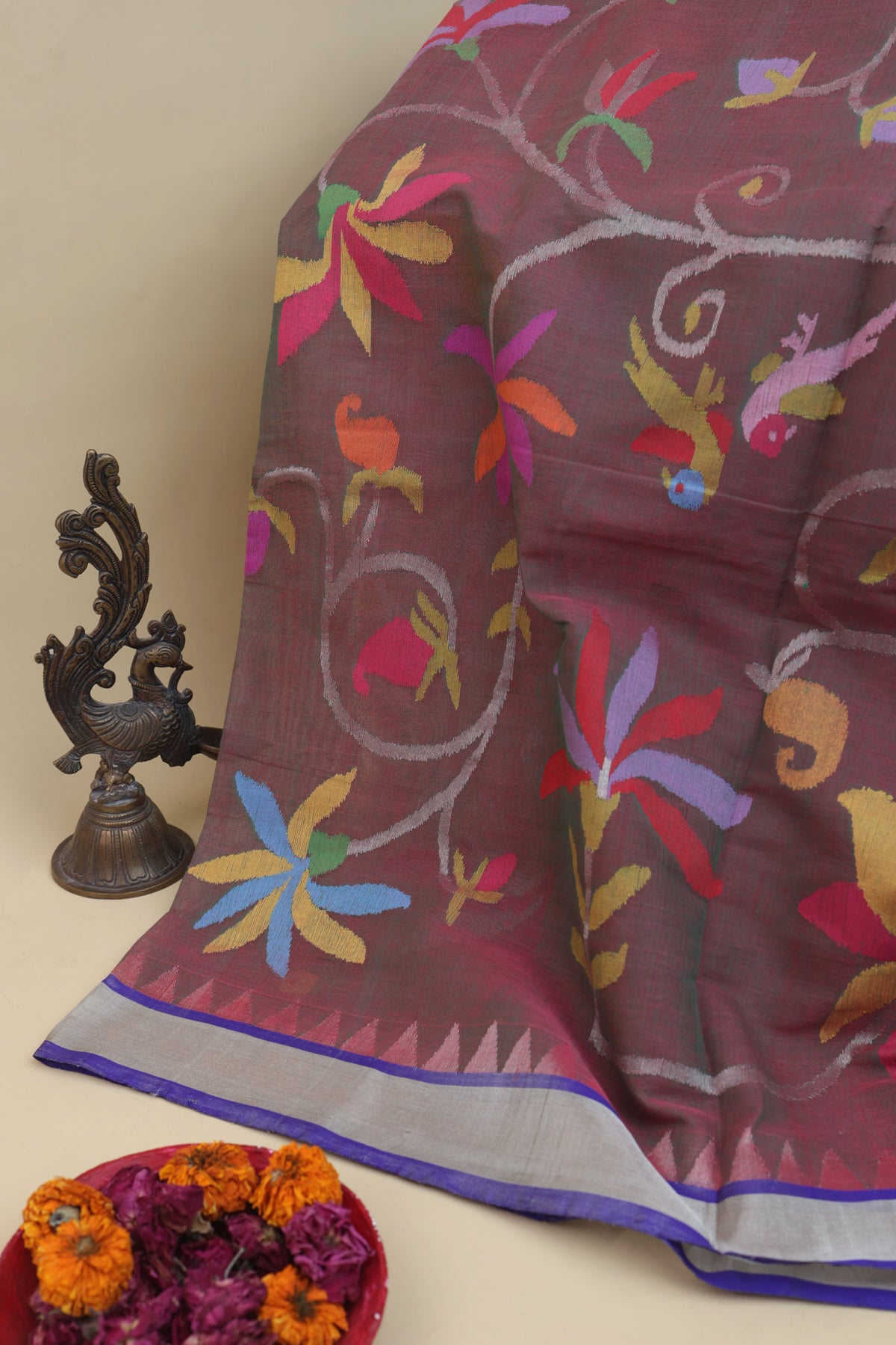 Embrace the allure of tradition with our Khaadi Cotton Dual Colour Saree, perfect for wedding and festive celebrations, radiating timeless allure. The plain body sets a regal foundation, accentuated by the intricate kaddi border that exudes traditional opulence. Adorned with delicate florals and birds, the pallu adds a touch of vintage elegance. Paired with a self with border blouse, this ensemble ensures you embody opulent grace on your special day.