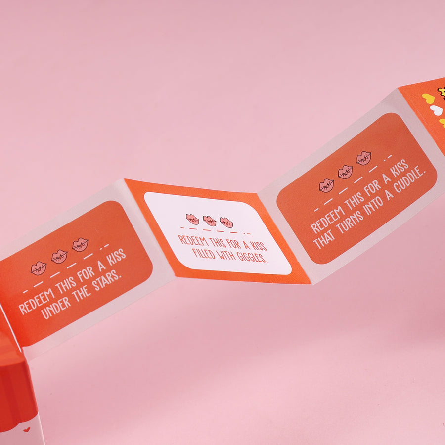 Kiss Coupons is basically a tiny slot machine for kisses. Your Valentine can pull out a coupon and claim the kiss mentioned on it — French Kiss, Wet Kiss, Peck on the Cheek, and more. No negotiations. No excuses. Just smooches.