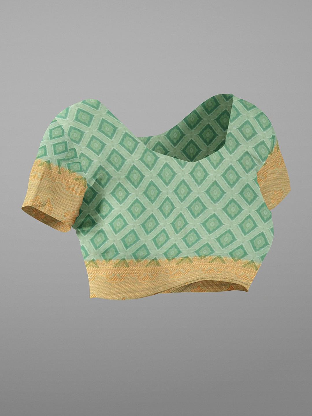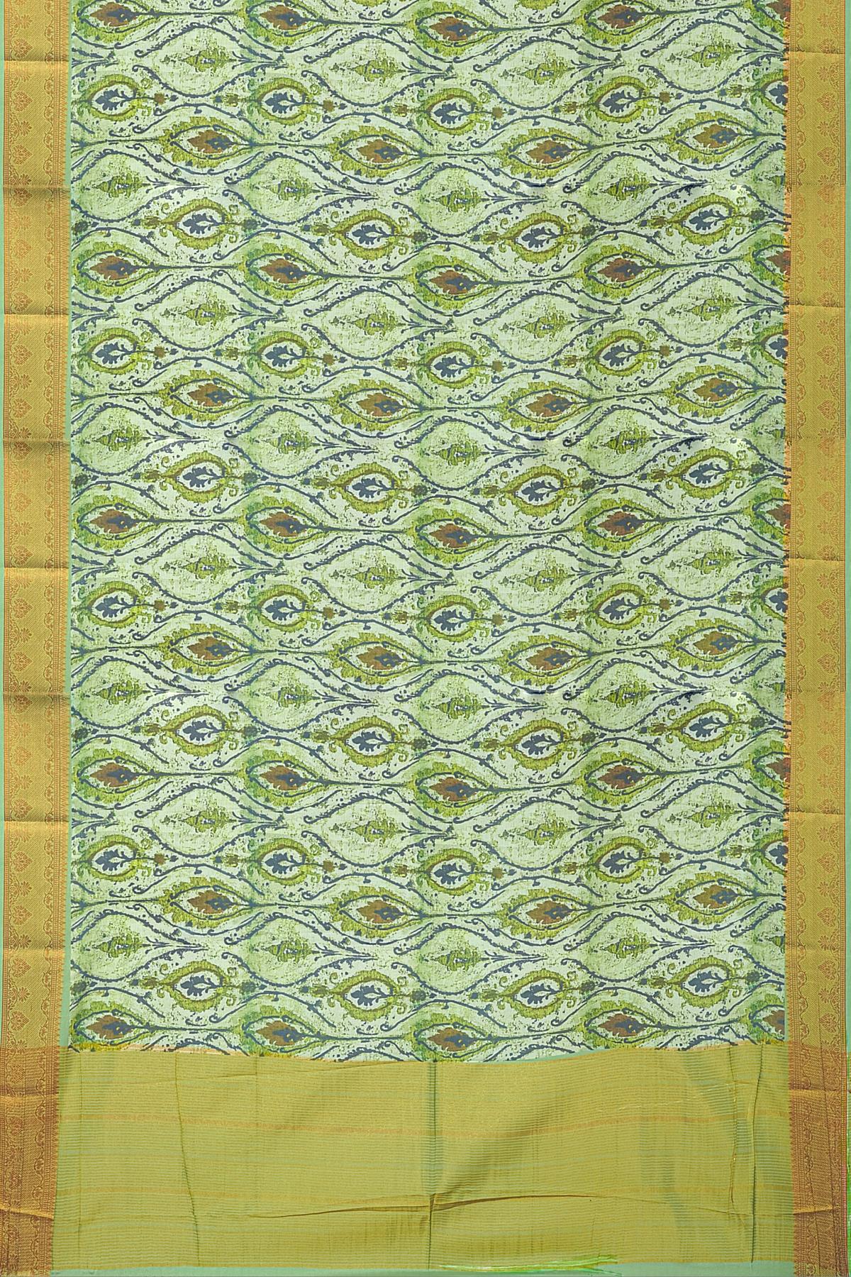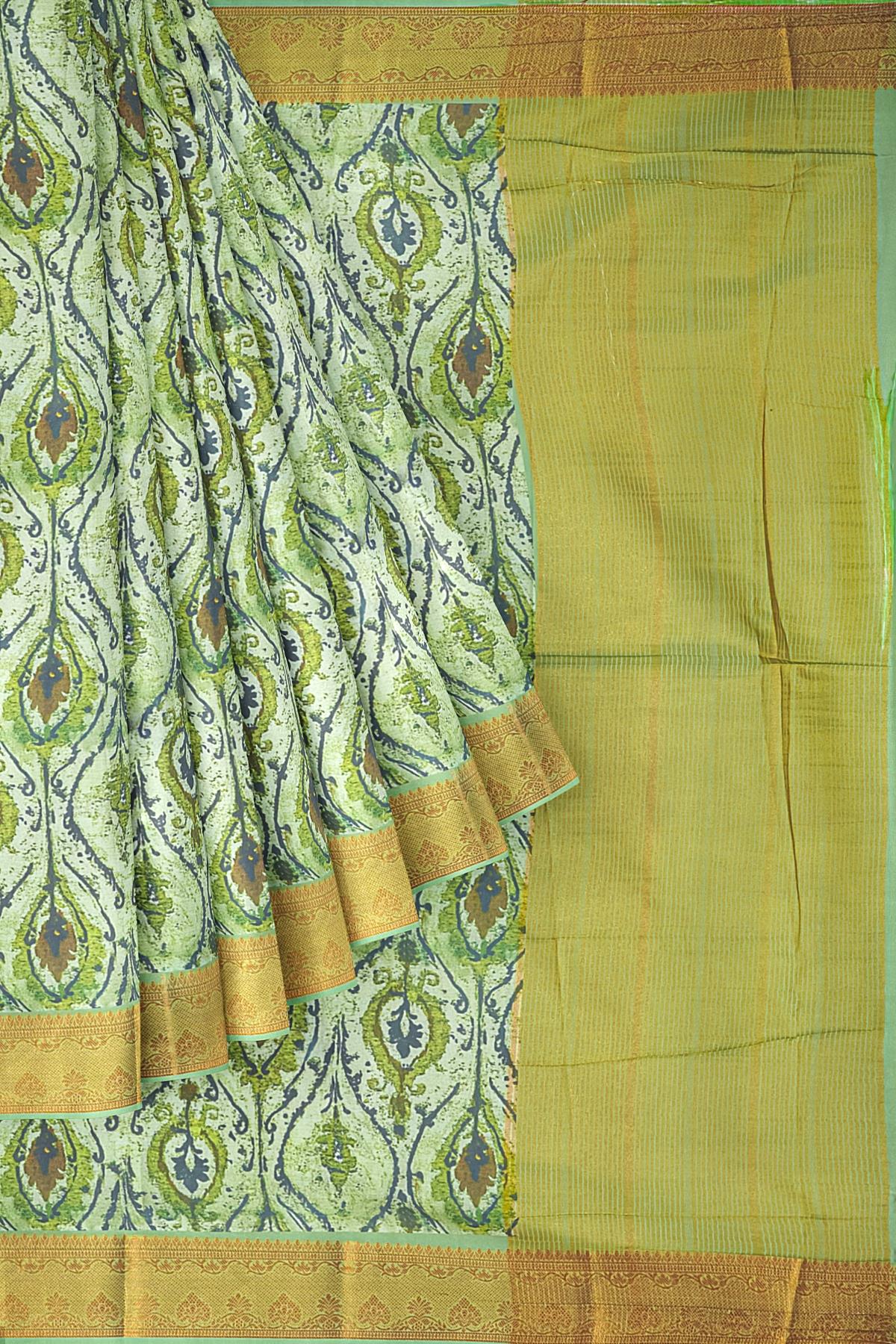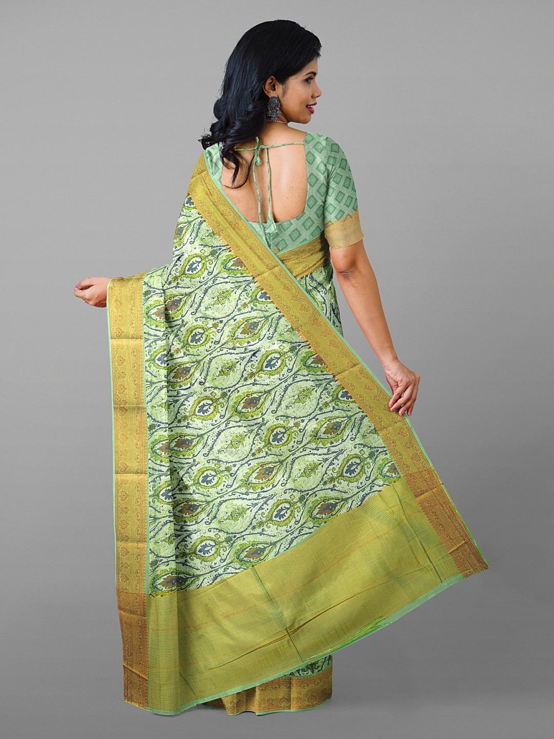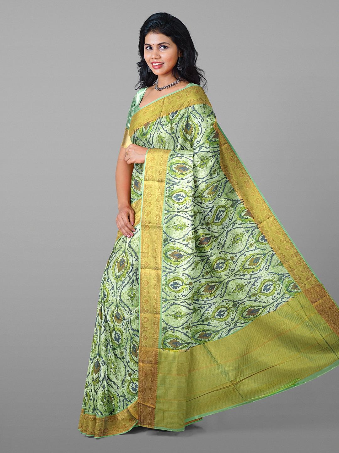 Latest LIGHT OLIVE GREEN DIGITAL PRINT SILK Saree with ZARI border. This saree comes with PRINT WITH BORDER SILK blouse.