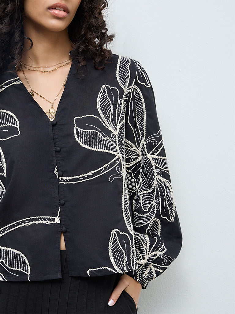 LOV Black Foliage Embroidered Cotton Blouse
