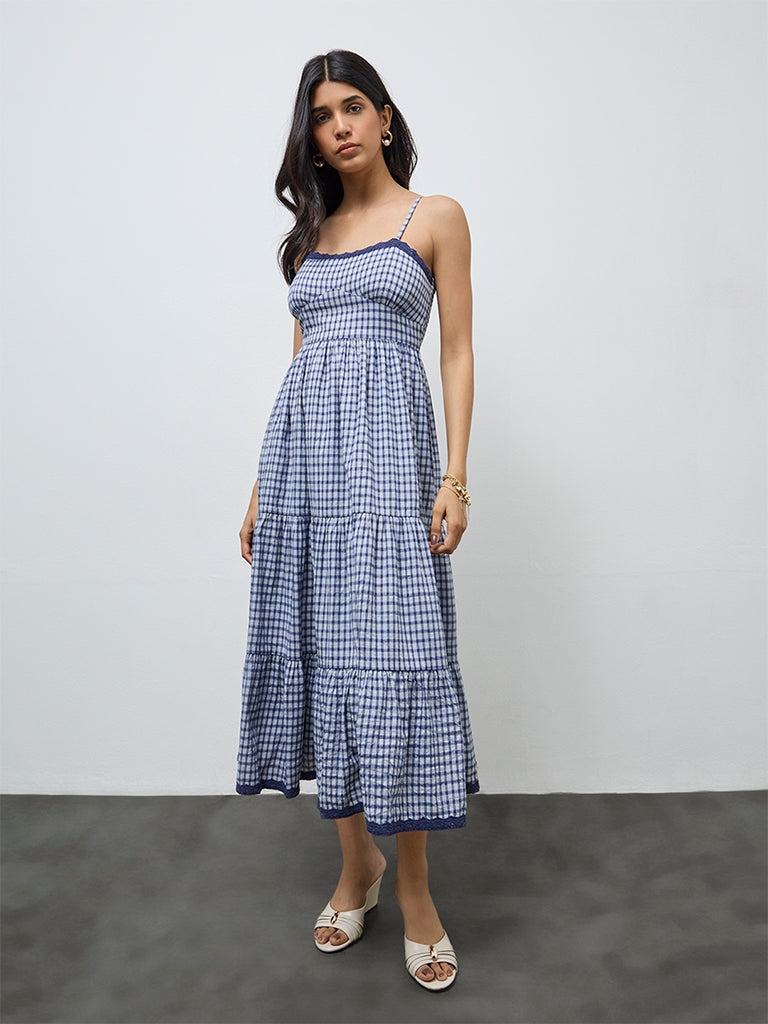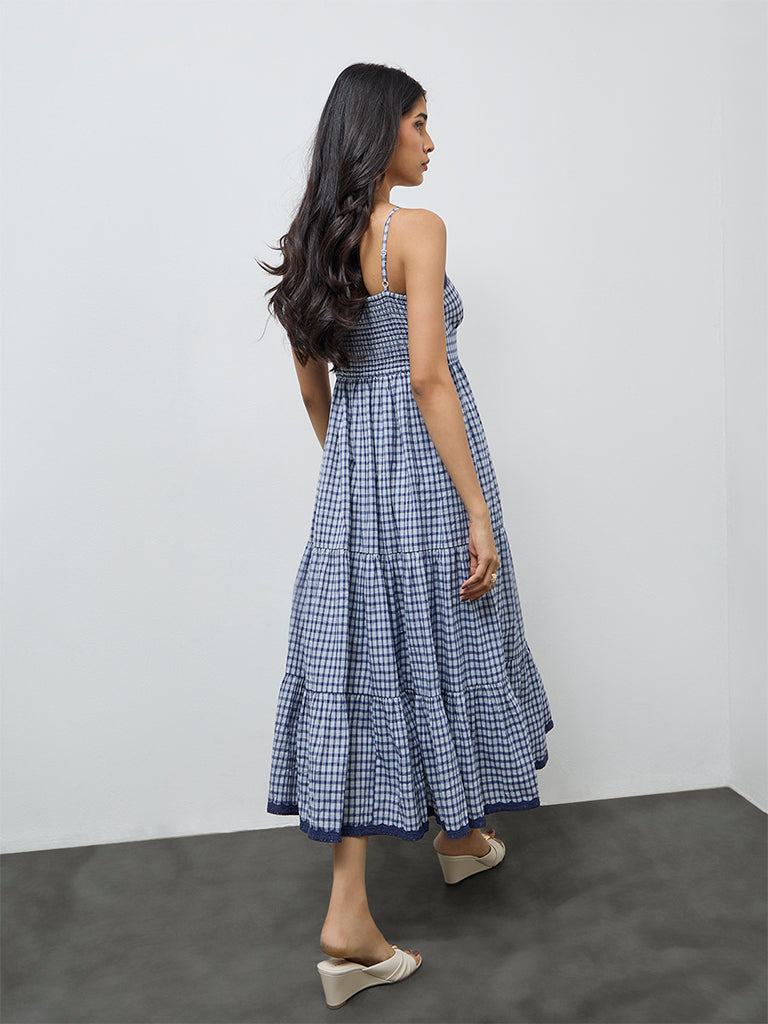 LOV Navy Checkered Cotton-Blend Tiered Dress