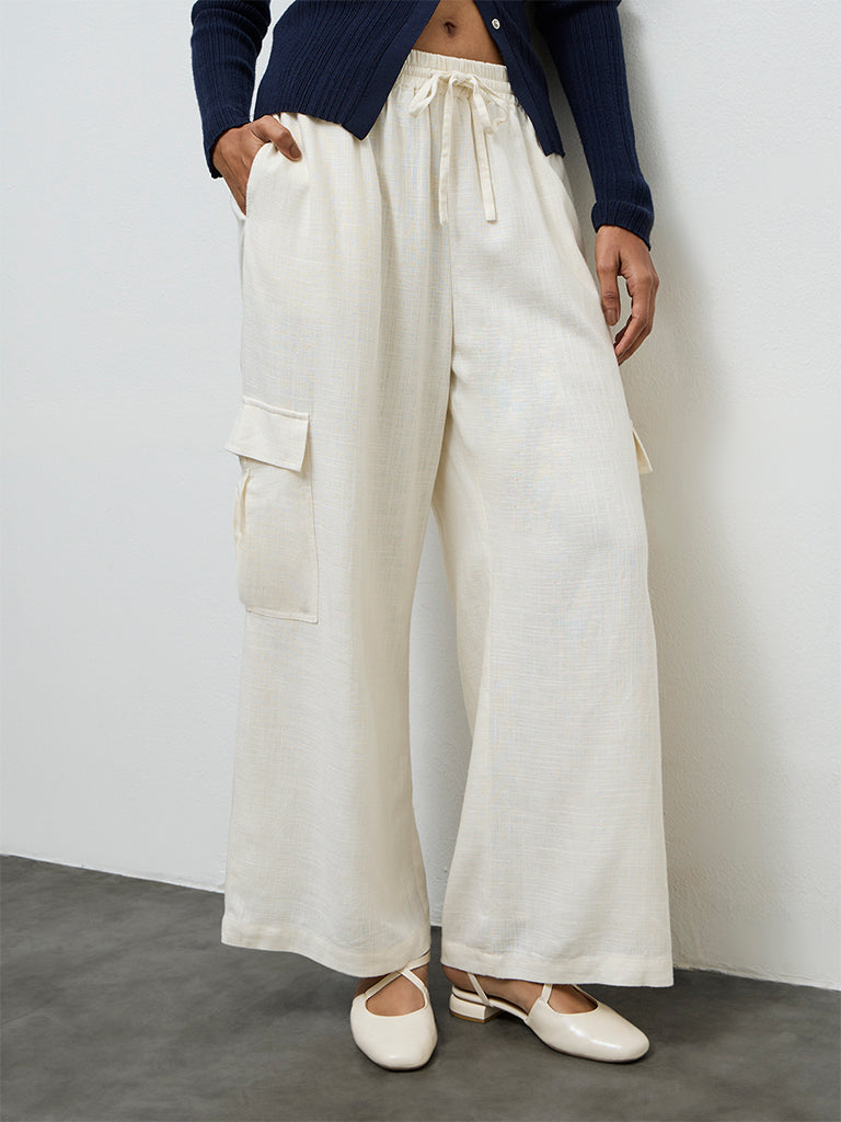 Refresh your everyday wardrobe with these off-white pants from LOV. Made from a soft, lightweight fabric that keeps the feel easy and breathable through the day, they are designed in a high-rise silhouette with an elasticated drawstring waistband for an adjustable fit. The style is completed with side pockets and flap pockets, adding a practical touch. Pair them with relaxed tops or structured shirts for effortless day-to-day styling.