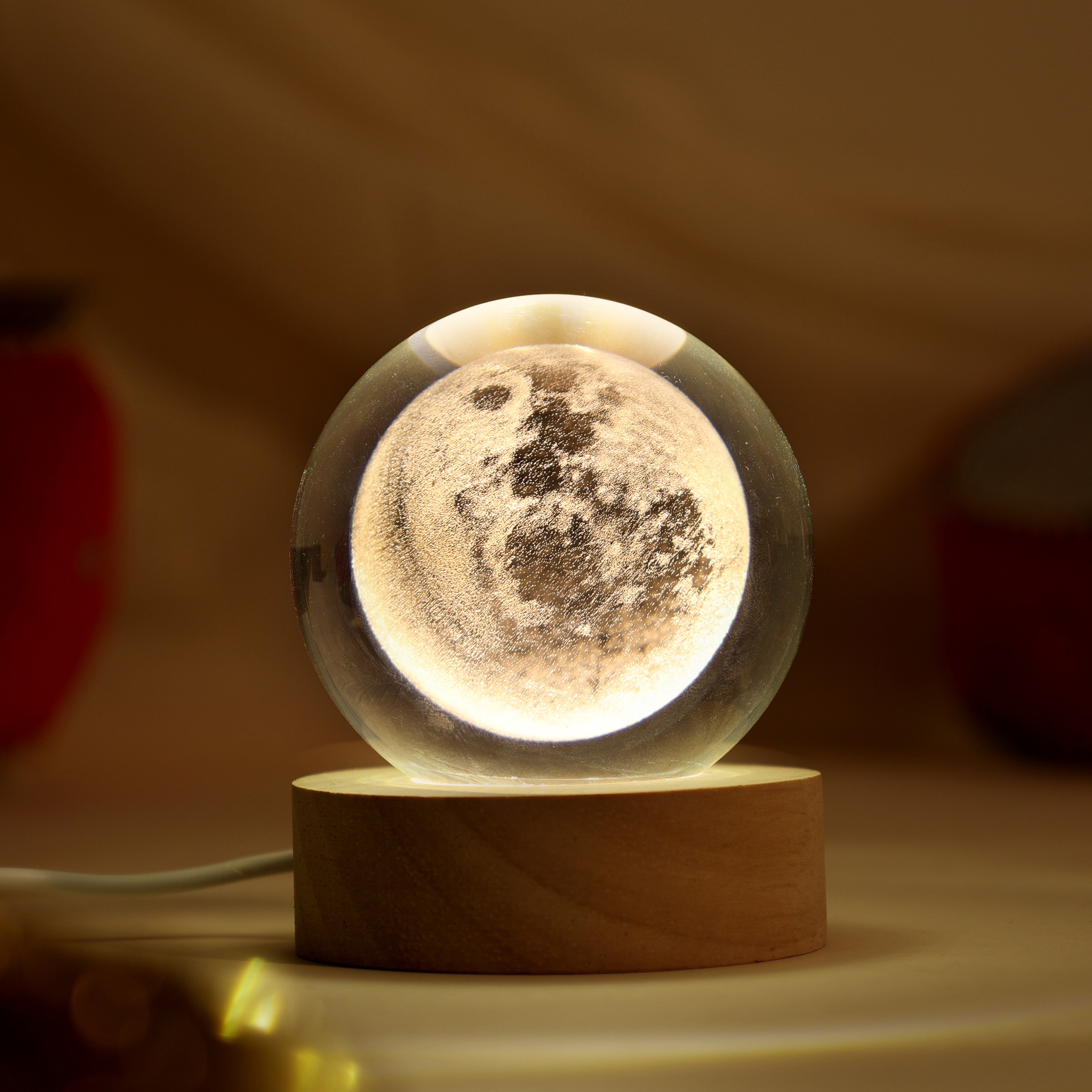 • Watch the lamp glow softly, illuminating the moon’s surface.