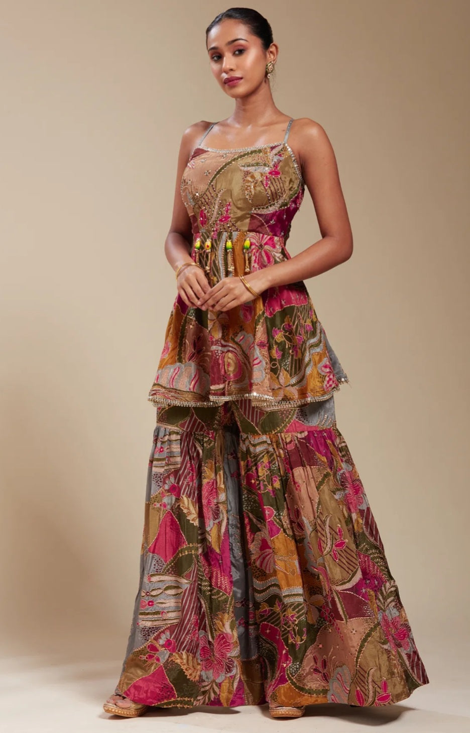 Designed in lightweight multicolor georgette, this Indo-Western lehenga features a statement designer piece paired with a coordinated dupatta. The fluid silhouette and contemporary detailing make it a perfect choice for festive gatherings, sangeet nights, and modern celebration looks.