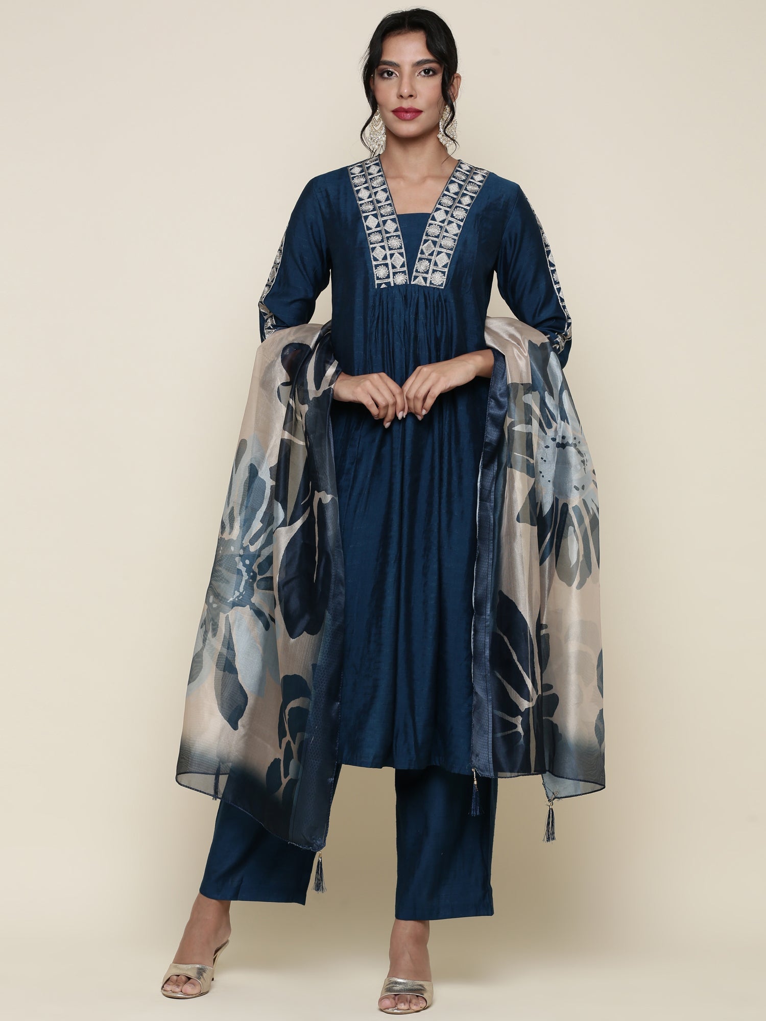 The Muslin Midnight Blue Embroidered Three-Piece Suit Set exudes understated elegance with its lightweight muslin fabric and detailed embroidery. This ensemble includes a thoughtfully designed kurta, coordinating trousers, and a matching dupatta, providing a harmonious and polished look. Ideal for formal occasions, it combines comfort with refined craftsmanship for a timeless appeal.