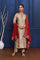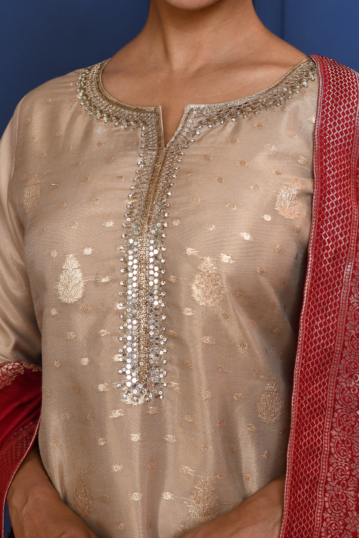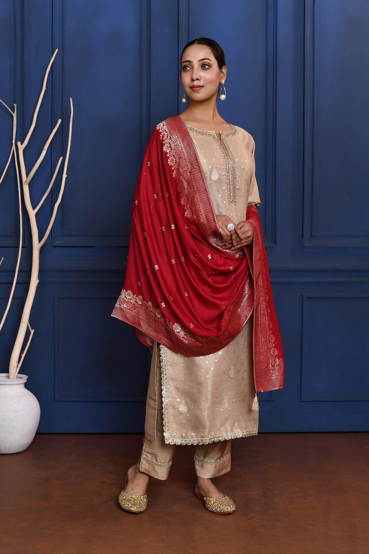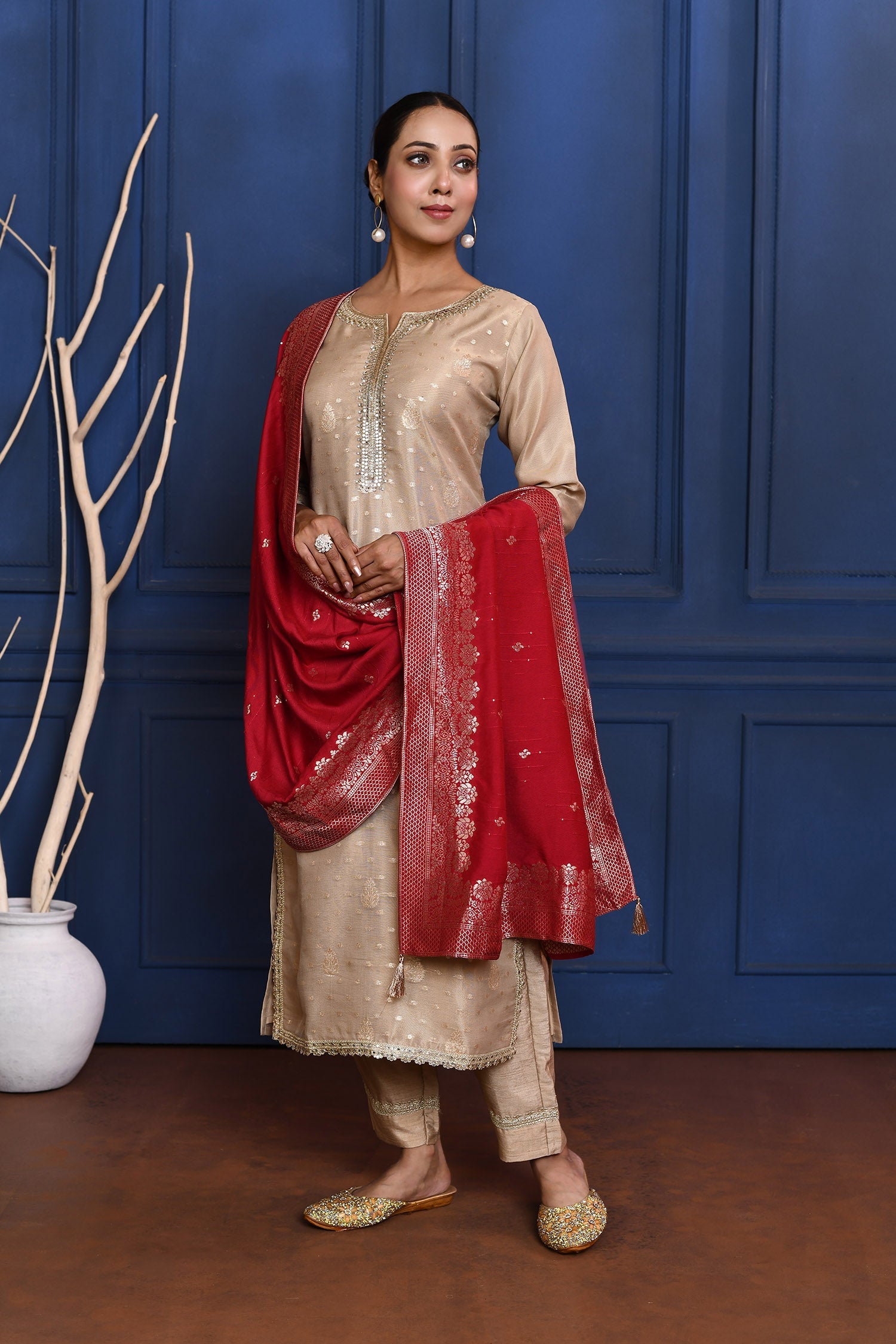 The off-white tissue banarasi kurta with zari buttis along with red crepe dupatta and pants for a neat traditional look with elegance.