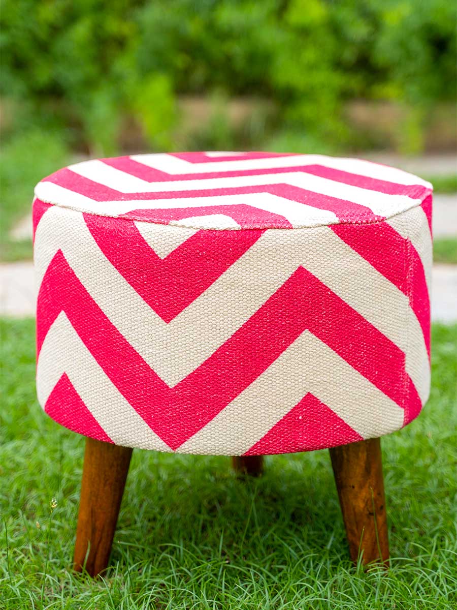 A beautiful combination of utility and design, our ottomans will find a fit in any space. Break the monotony of pastels and wood with a pop of color, and while at it, don't forget to marvel at the finesse and handcraft of each piece. Featuring solid wood legs and handloom rug upholstery in vintage distressed finish.