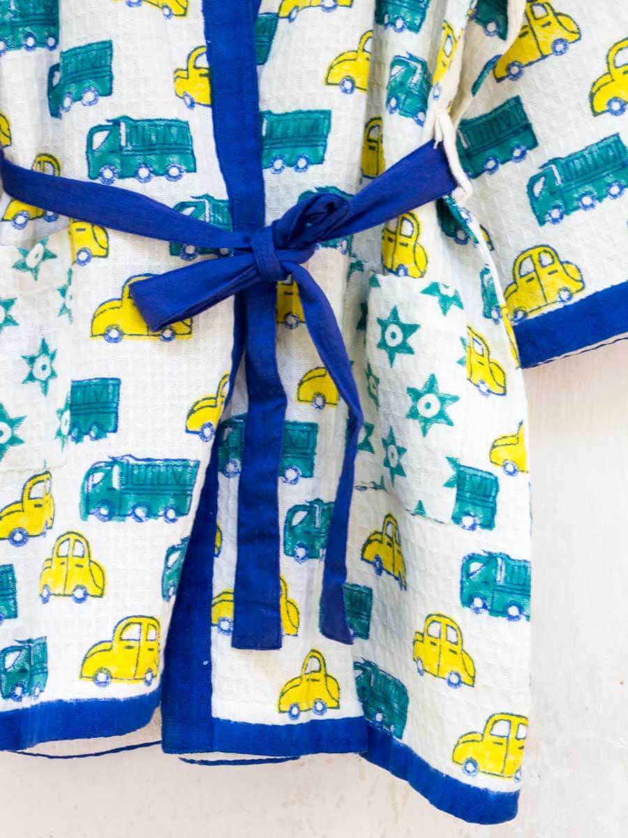Bathing has never been more fun! Crafted in premium waffle cotton, these hand block print bath robes make for a cute addition in your child's wardrobe. The bath robe comes with an adjustable belt inside for easy fastening.
