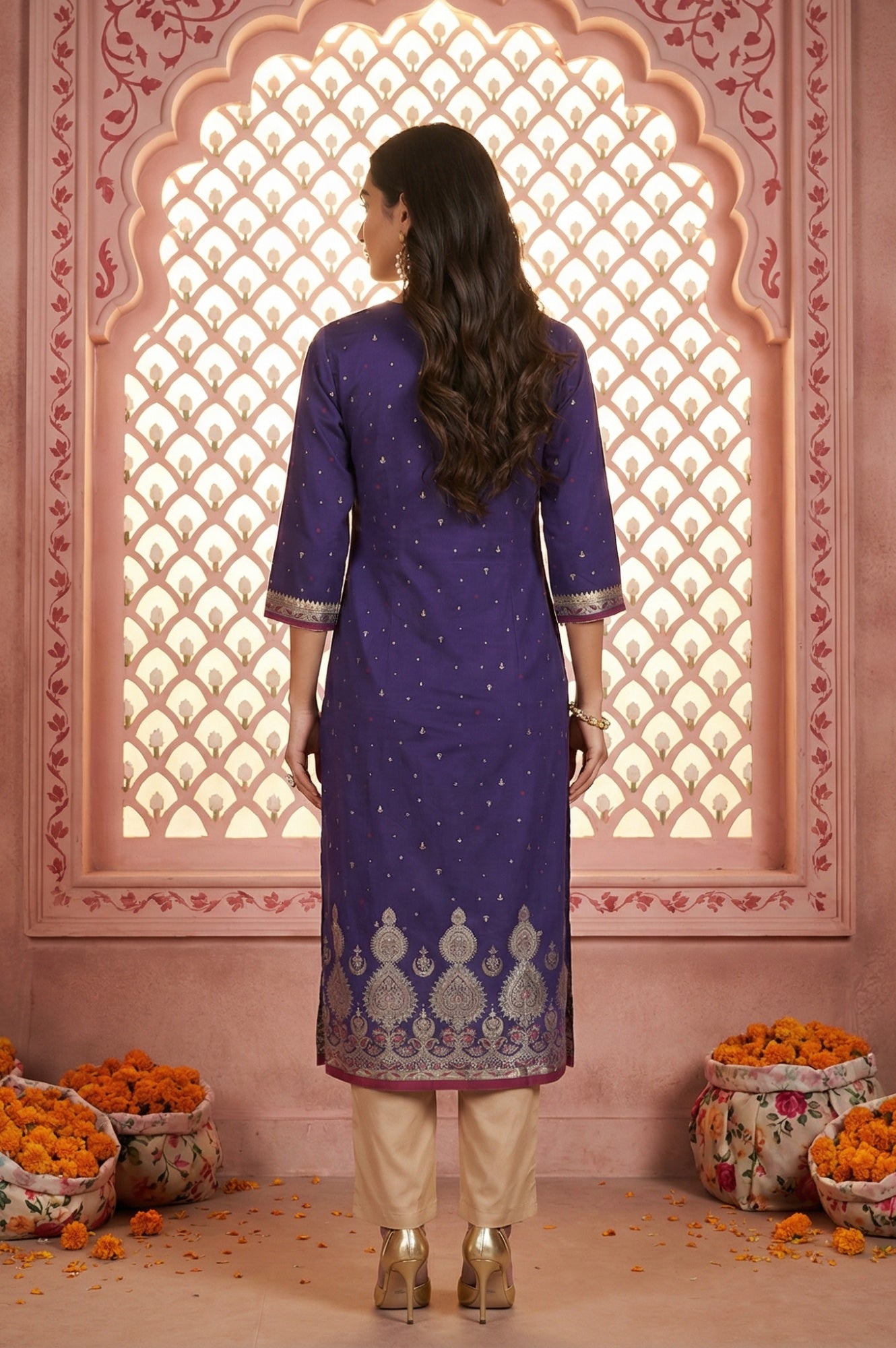 Shine at your next celebration in this purple viscose blend kurta by Aurelia. Designed for the modern festive wardrobe, it features a geometric gold foil print that catches the light beautifully, complemented by delicate sequin work along the V-neckline. The comfortable straight silhouette with side slits and three-quarter sleeves offers a classic fit perfect for long events. Whether attending a wedding function or a family gathering, this lightweight Indian ethnic wear staple pairs effortlessly with gold churidars or beige pants. Complete the party wear look with statement earrings and heels for an elegant finish.