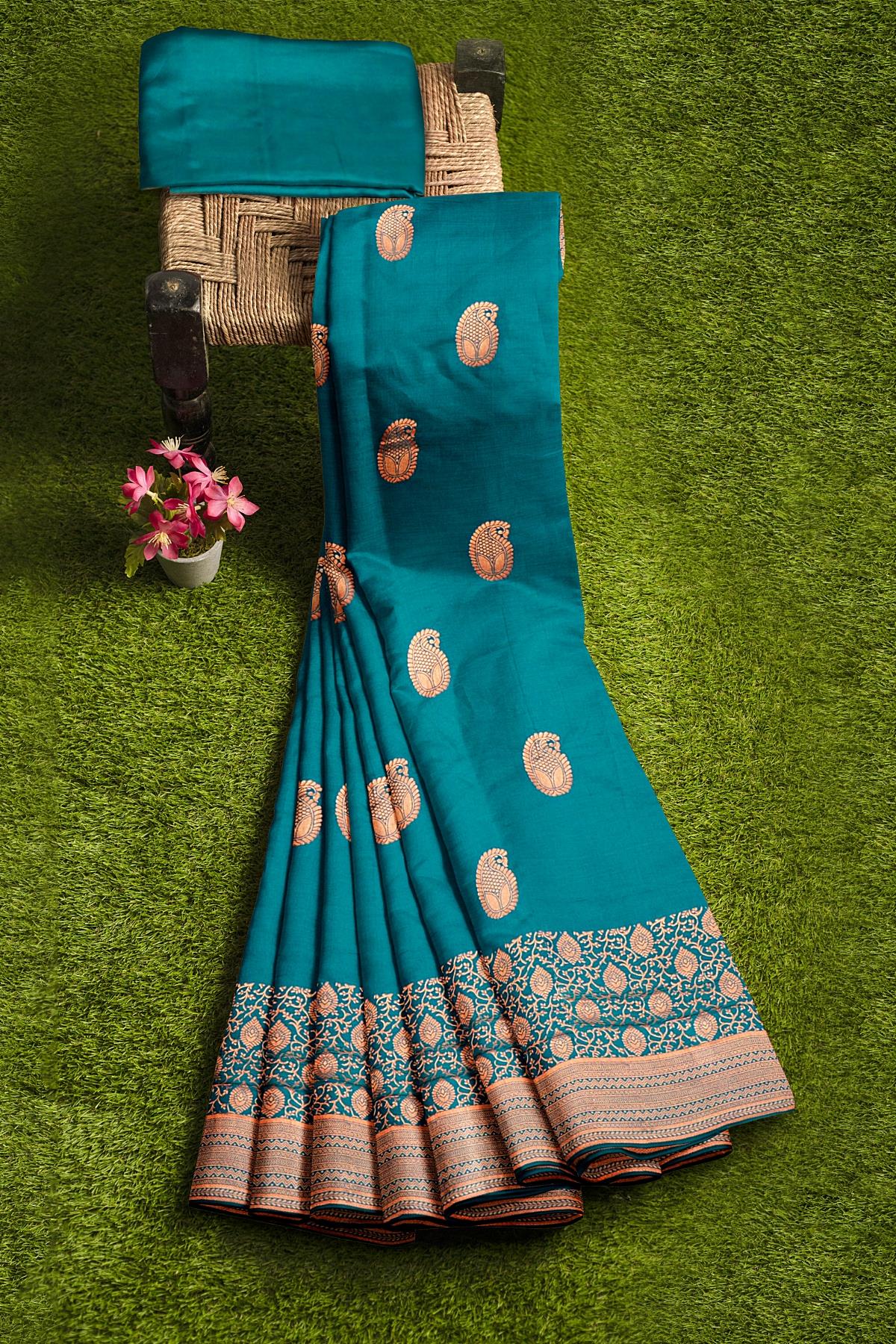 Latest RAMA GREEN BUTTIS SILK BLEND Saree with SELF ZARI border. This saree comes with PLAIN WITH BORDER SILK BLEND blouse.