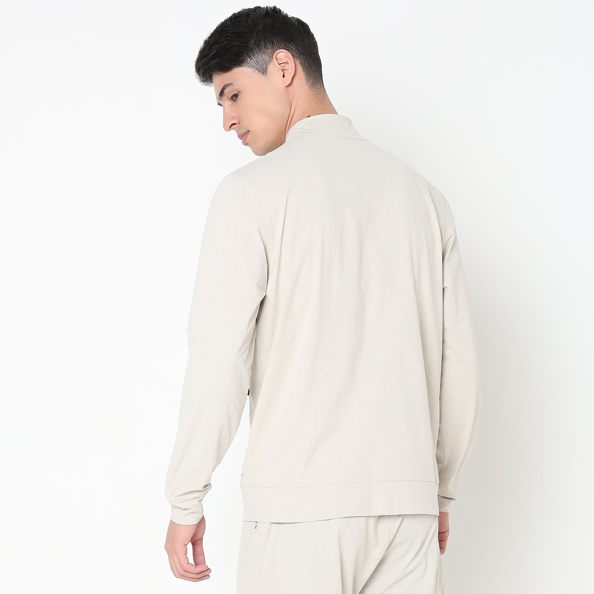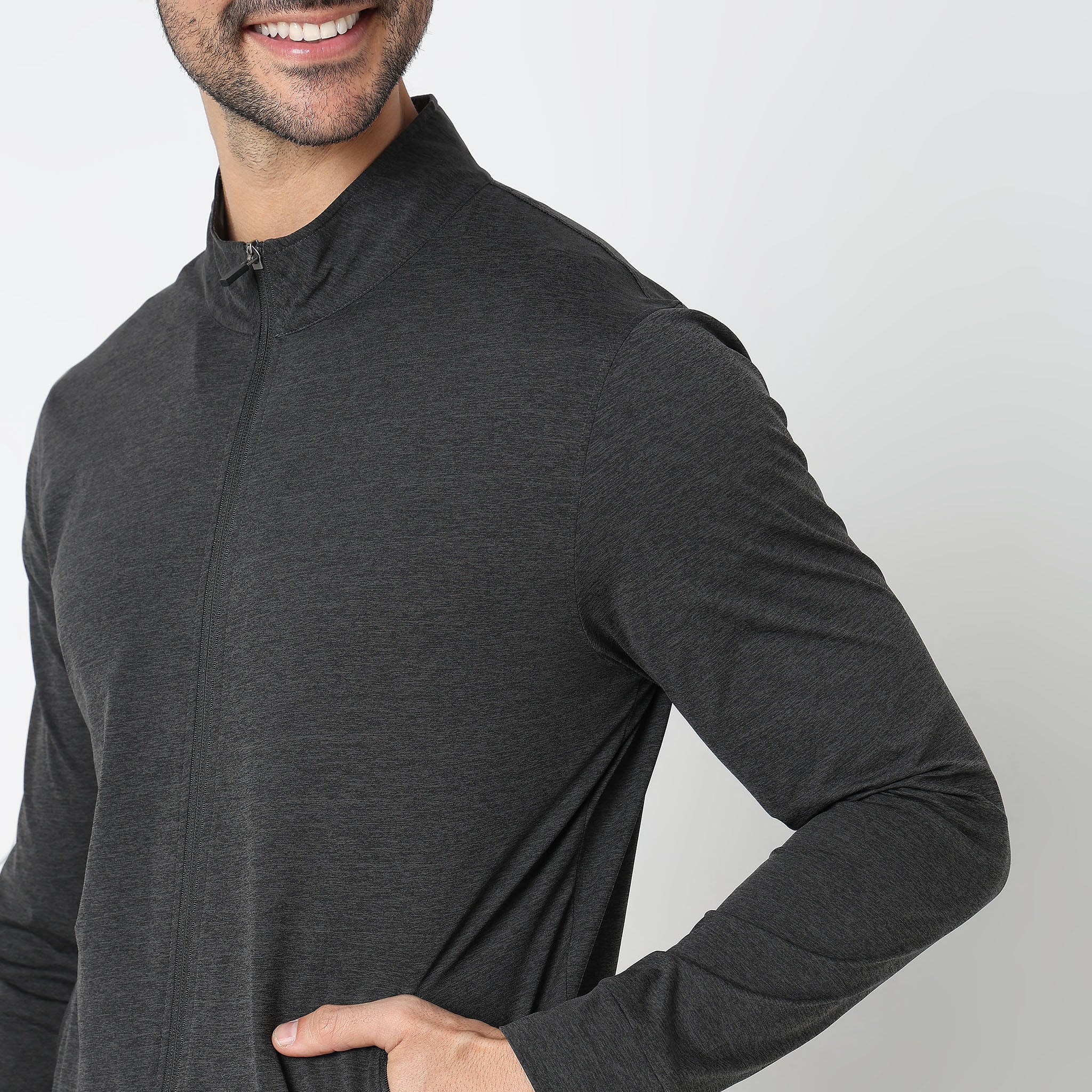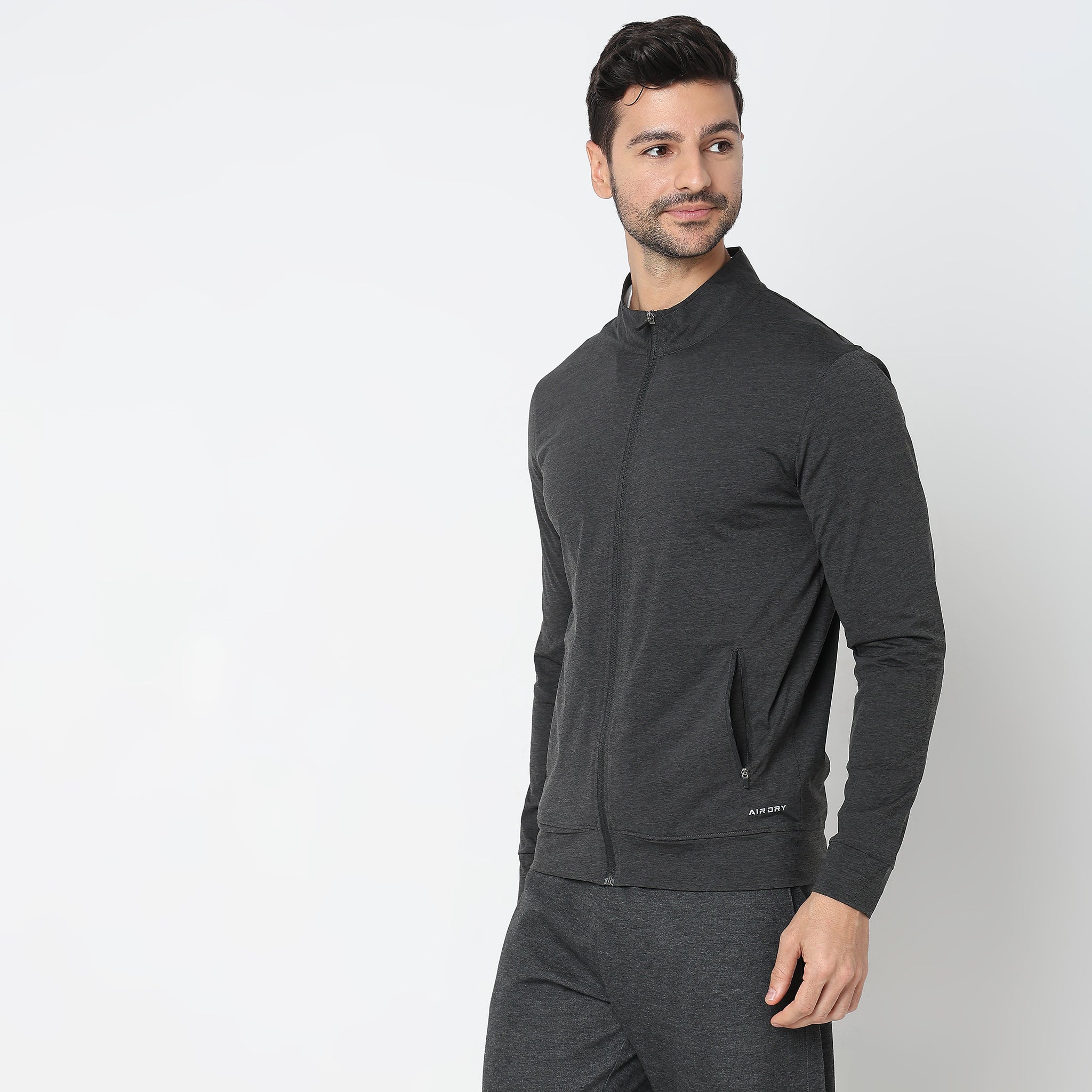 This modern activewear theme, solid pattern jacket has a high neck and full sleeve. Made from polyester, it is soft and comfortable to wear.