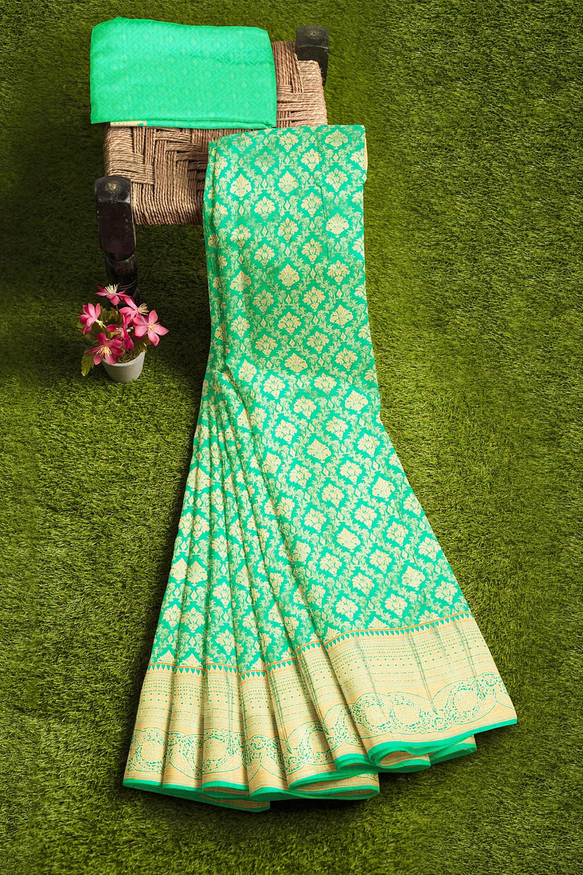 SEA GREEN and GOLD FLORAL JAAL SILK BLEND Saree with SEMI PATTU