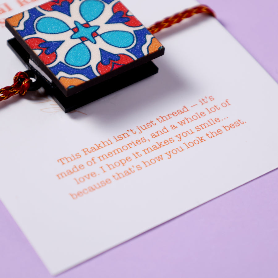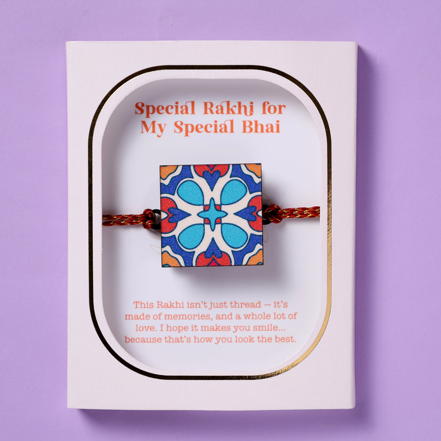 This rakhi is cleverly shaped like a tiny square box, secretly holding 6 photographs. Open it to unfold your memories in a magical, heartwarming way!