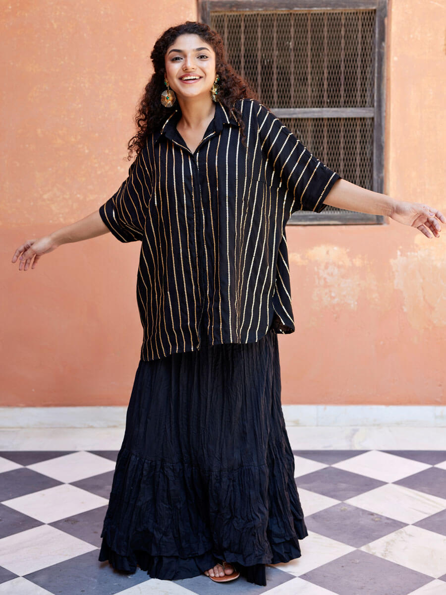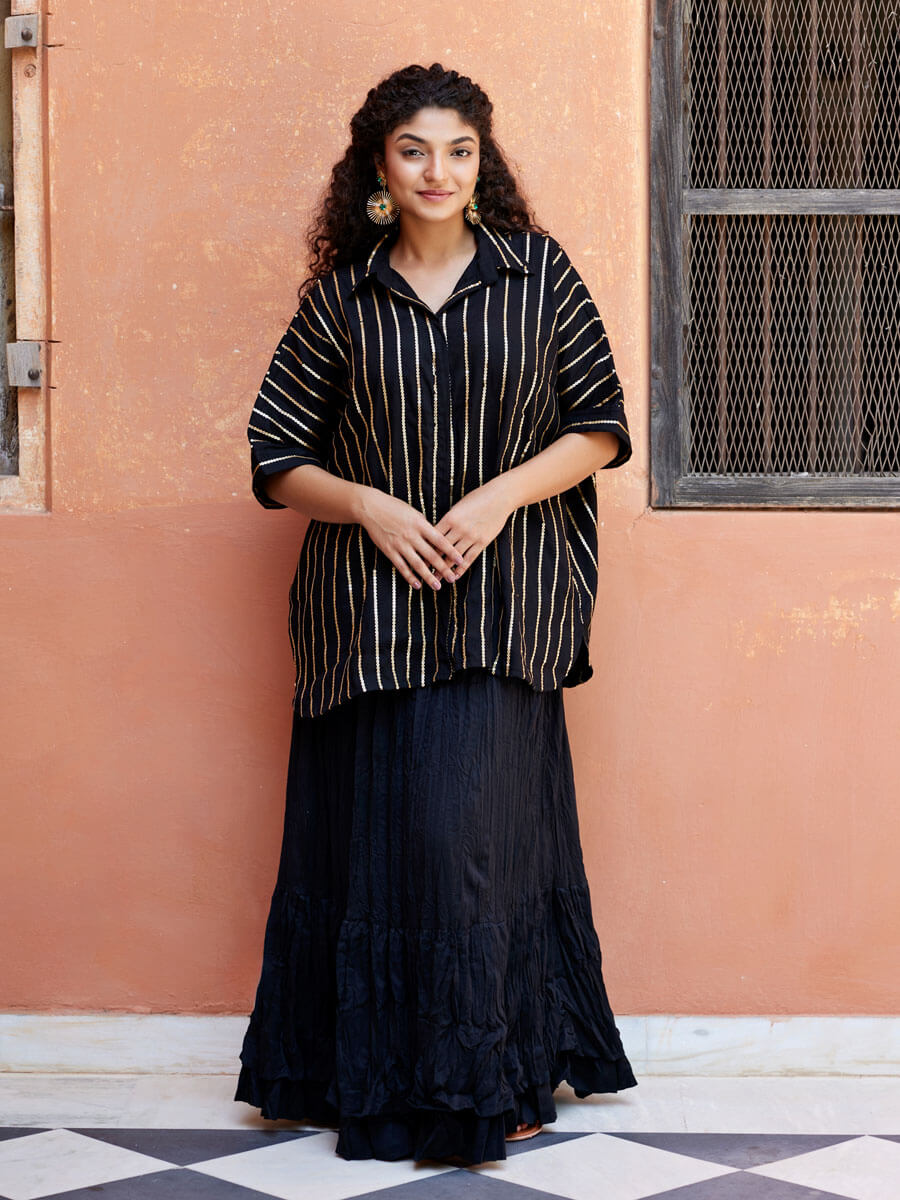 - Set includes: Sequined Oversized Shirt and crinckled skirt