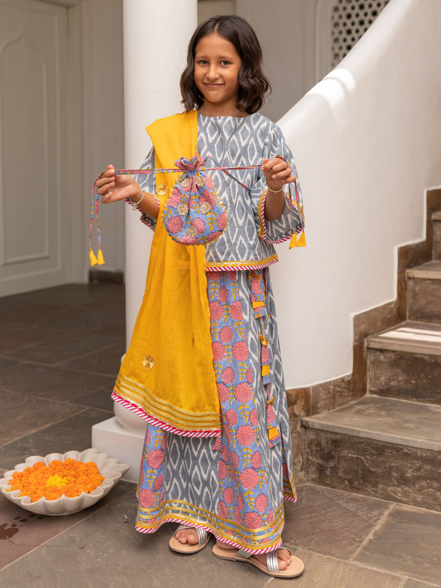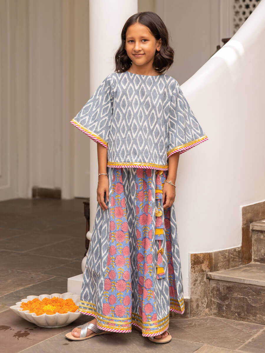 - Set includes: Top (with bell sleeves), skirt and dupatta