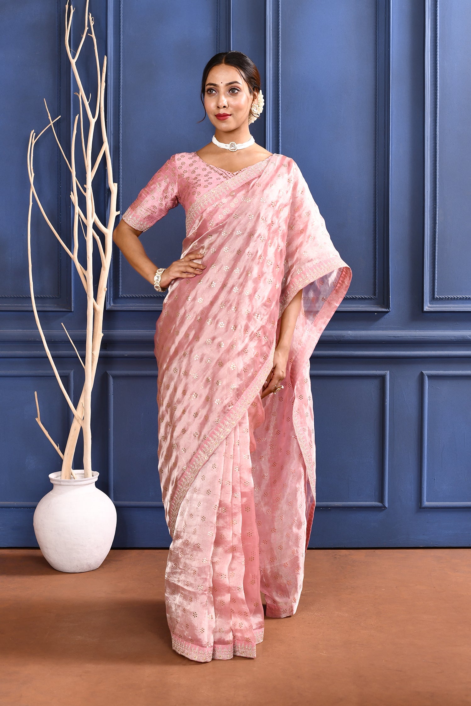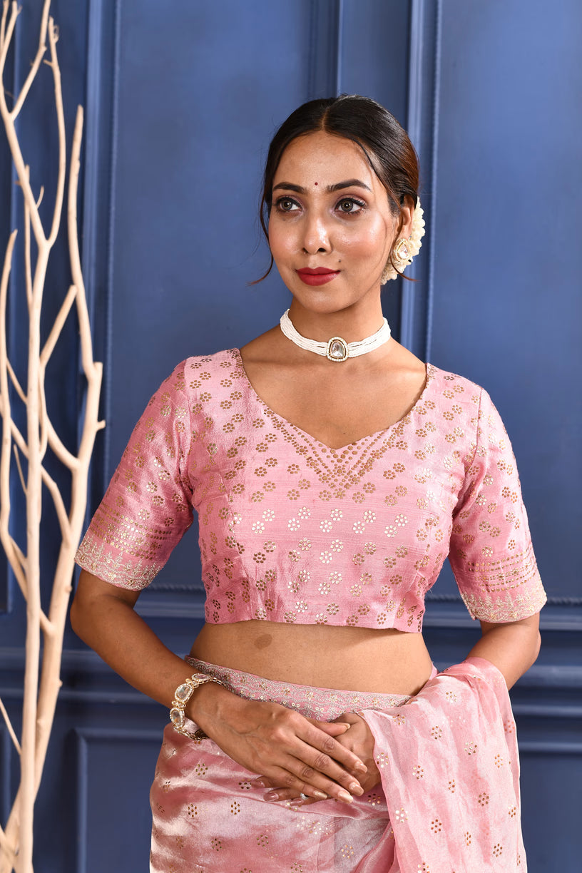 The soft pink tissue foil saree with embroidered border and stitched matching blouse for a classy shine with beautiful look.