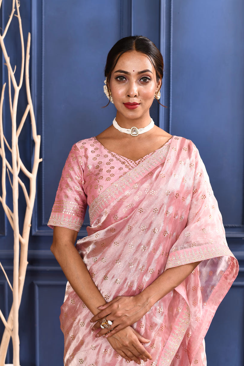 Soft Pink Embroidered Tissue Foil Saree