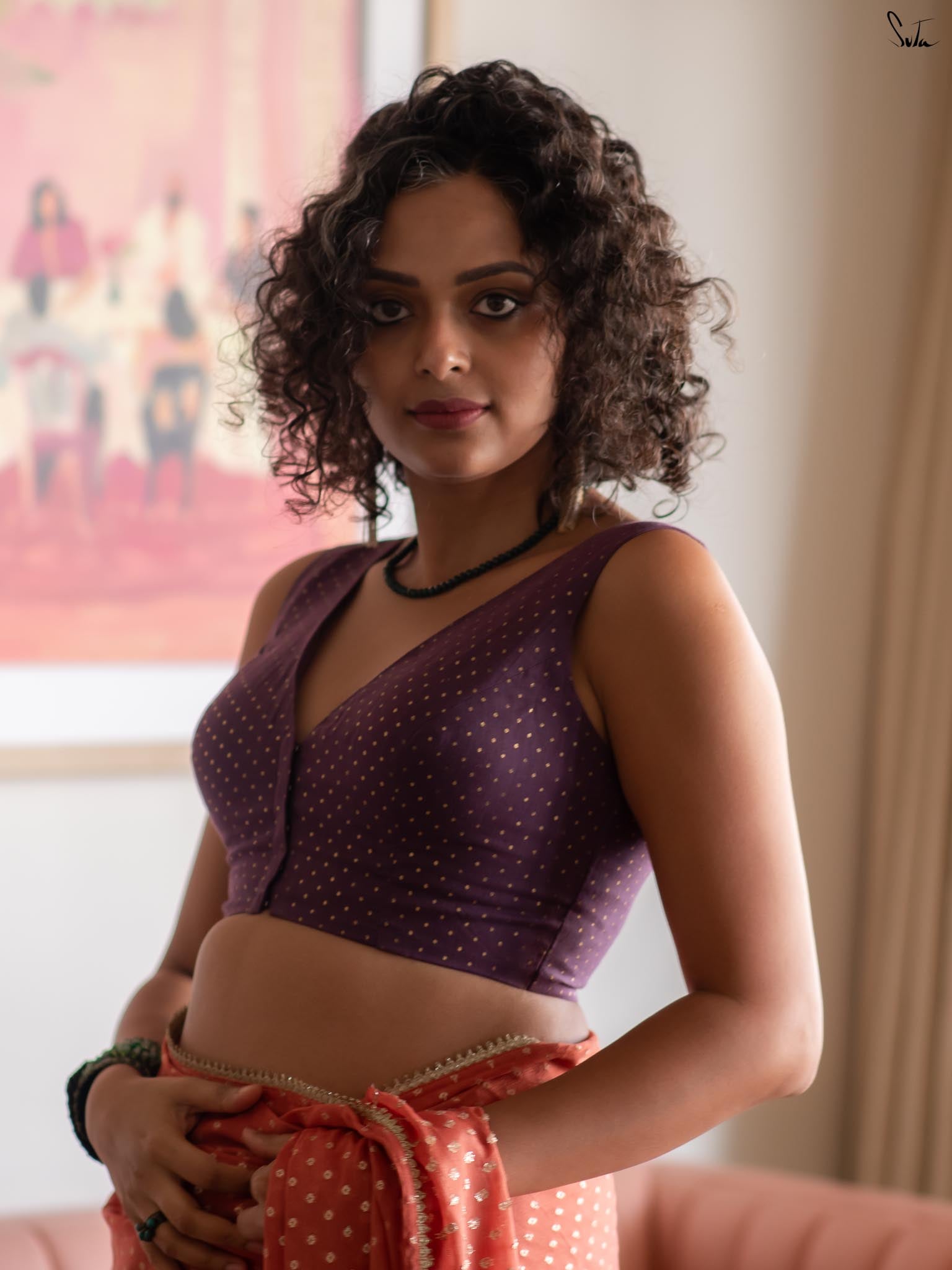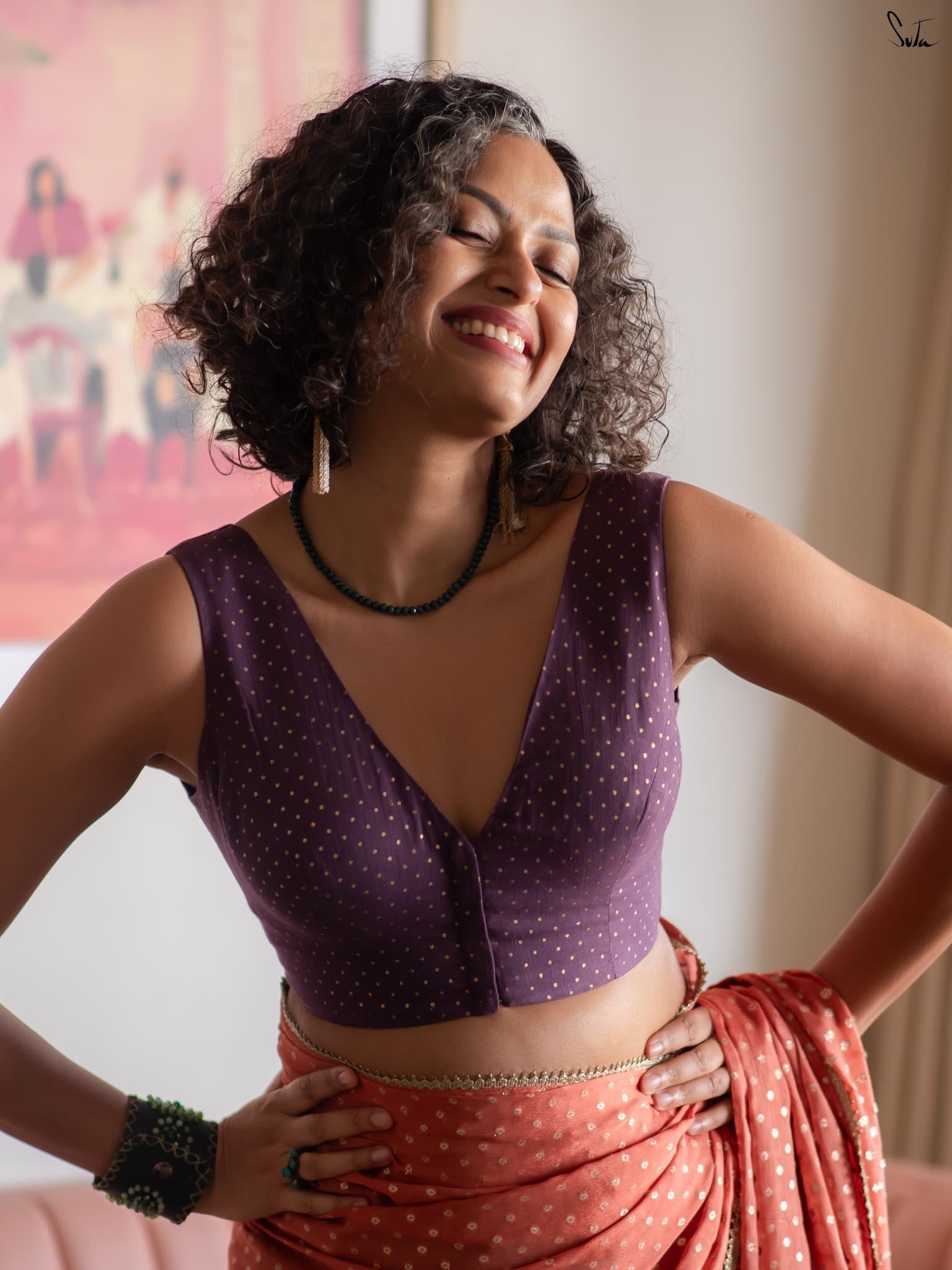 This purple cotton viscose blouse is designed with a graceful sleeveless silhouette and a flattering V-neckline. Scattered with delicate gold polka foil prints, it carries a playful shimmer that catches the light beautifully. The padded structure offers comfort and shape, while the front opening adds ease and functionality to the design.