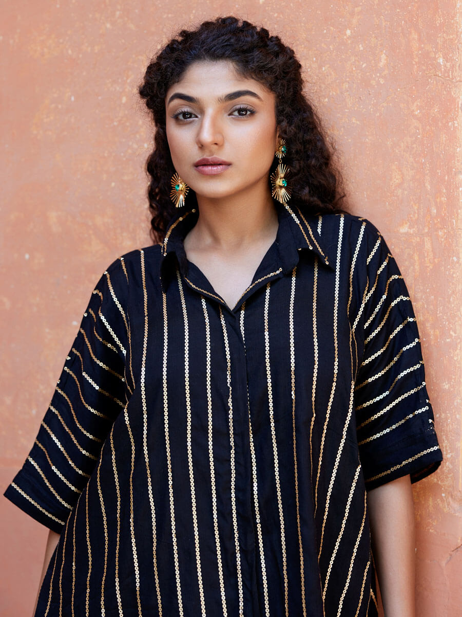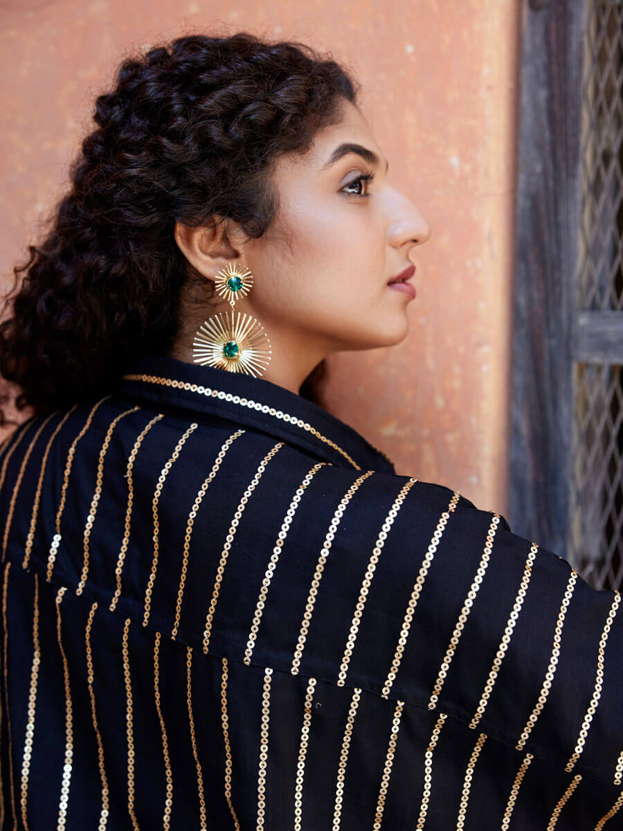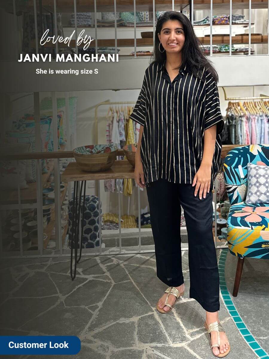 - How to style: Complete the look with a black crinkled skirt or black trousers or a black pair of shorts and statement earrings