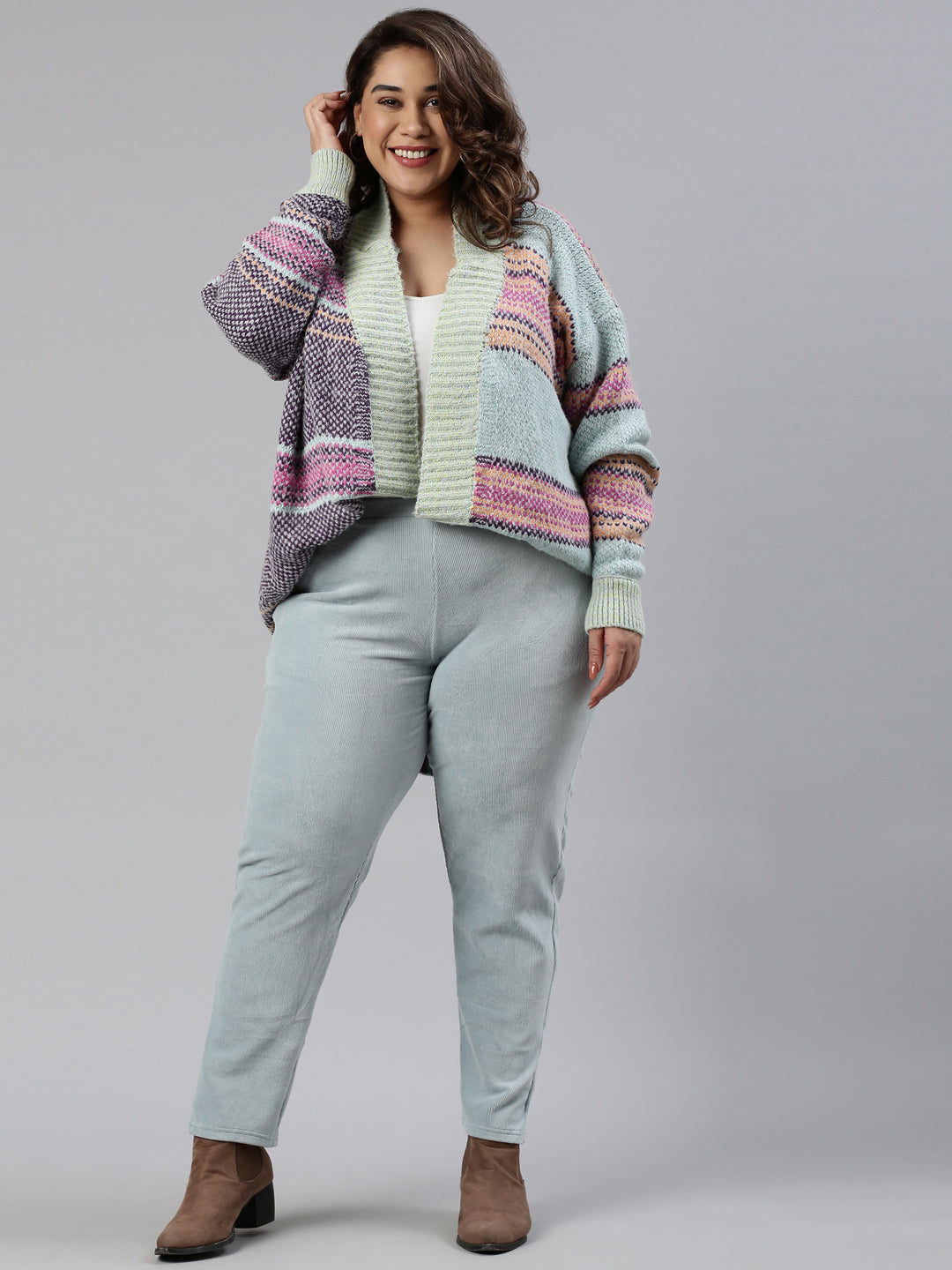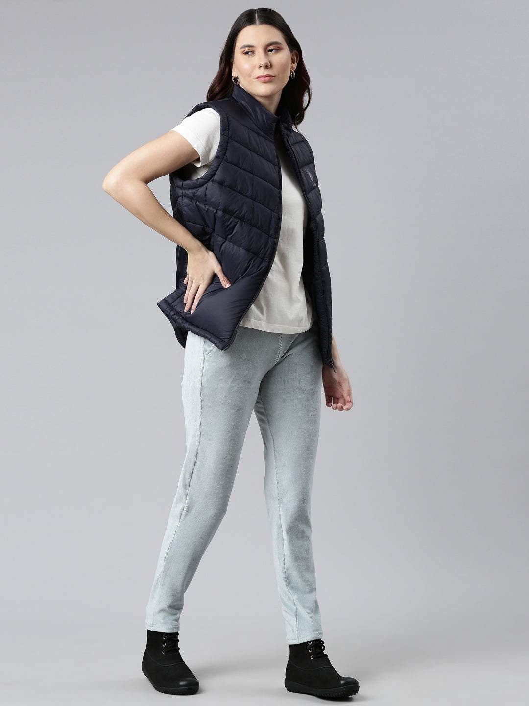 Bundle up in freezing temparatures in the Solid Dusty Blue Corduroy Jeggings. Made from cotton, polyester & PU, the slip on trousers have a elasticised waistband, slant pockets & a tapered fit.