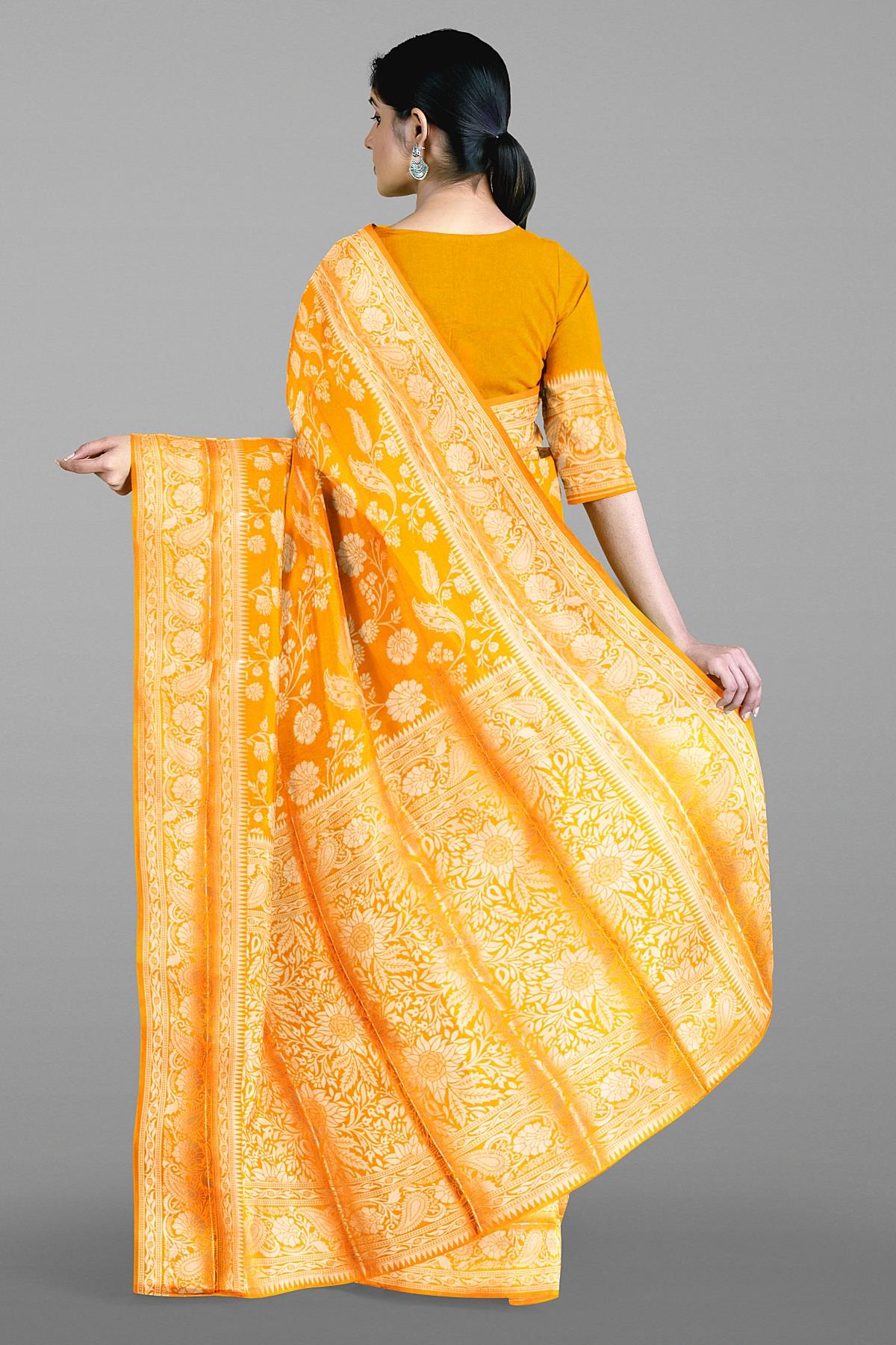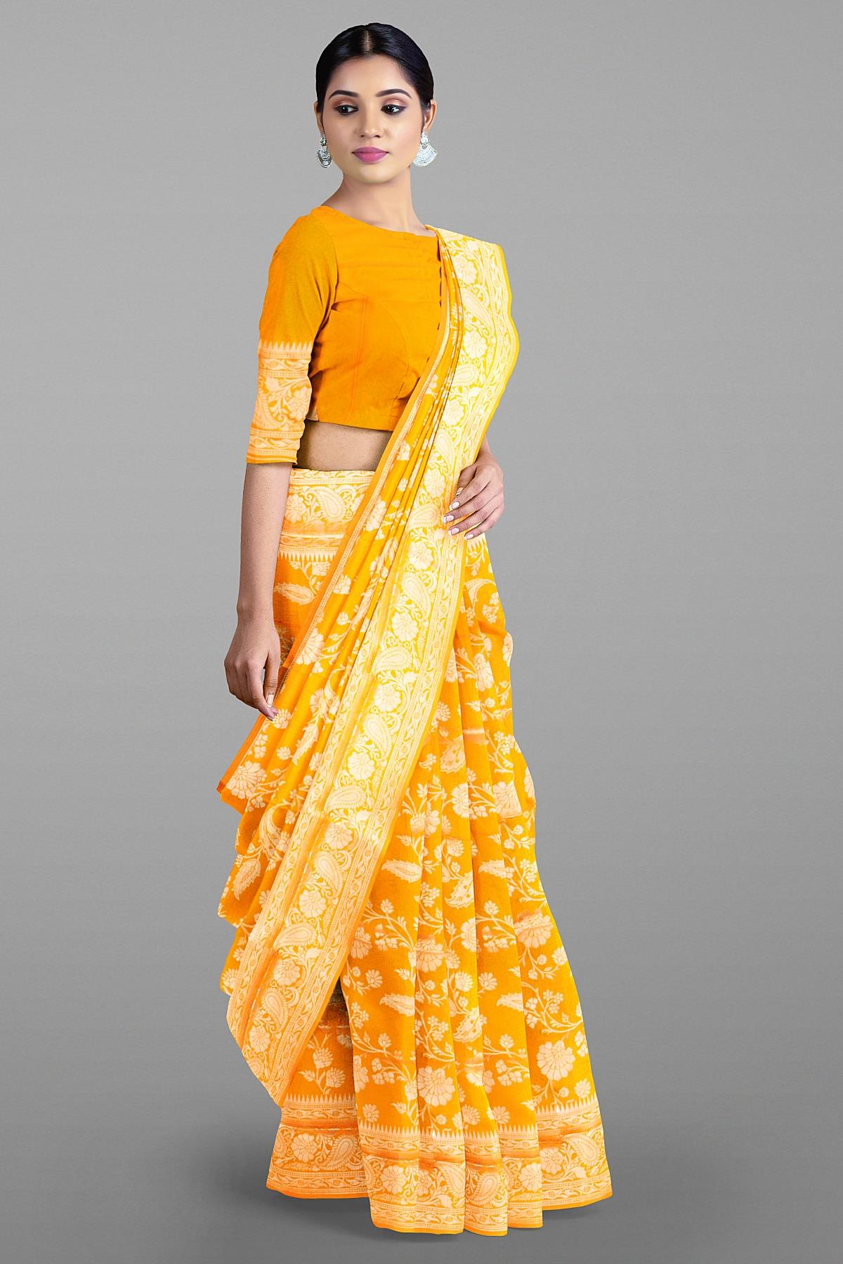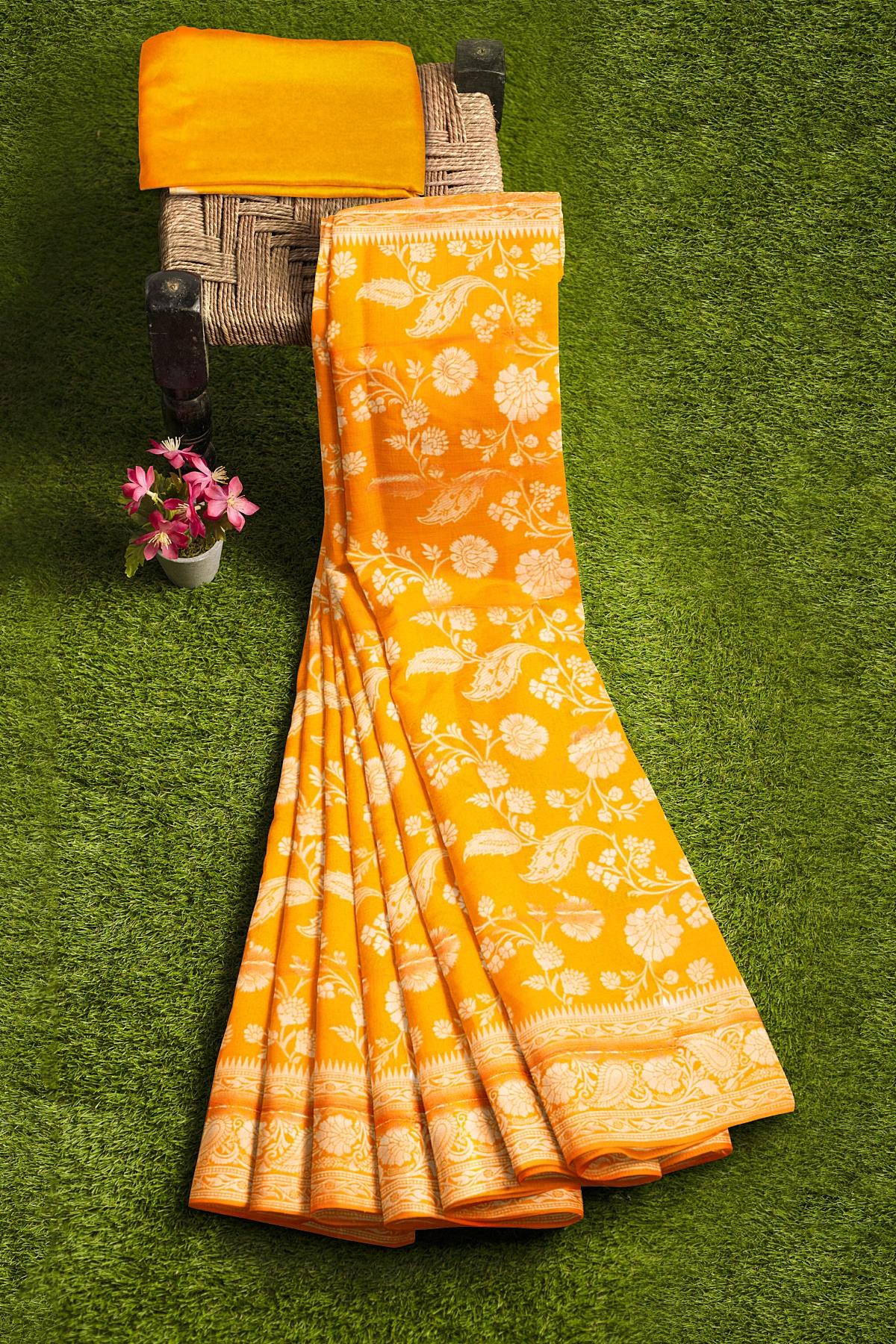 Latest YELLOW FLORALS SILK BLEND Saree with SELF ZARI border. This saree comes with PLAIN WITH BORDER SILK BLEND blouse.