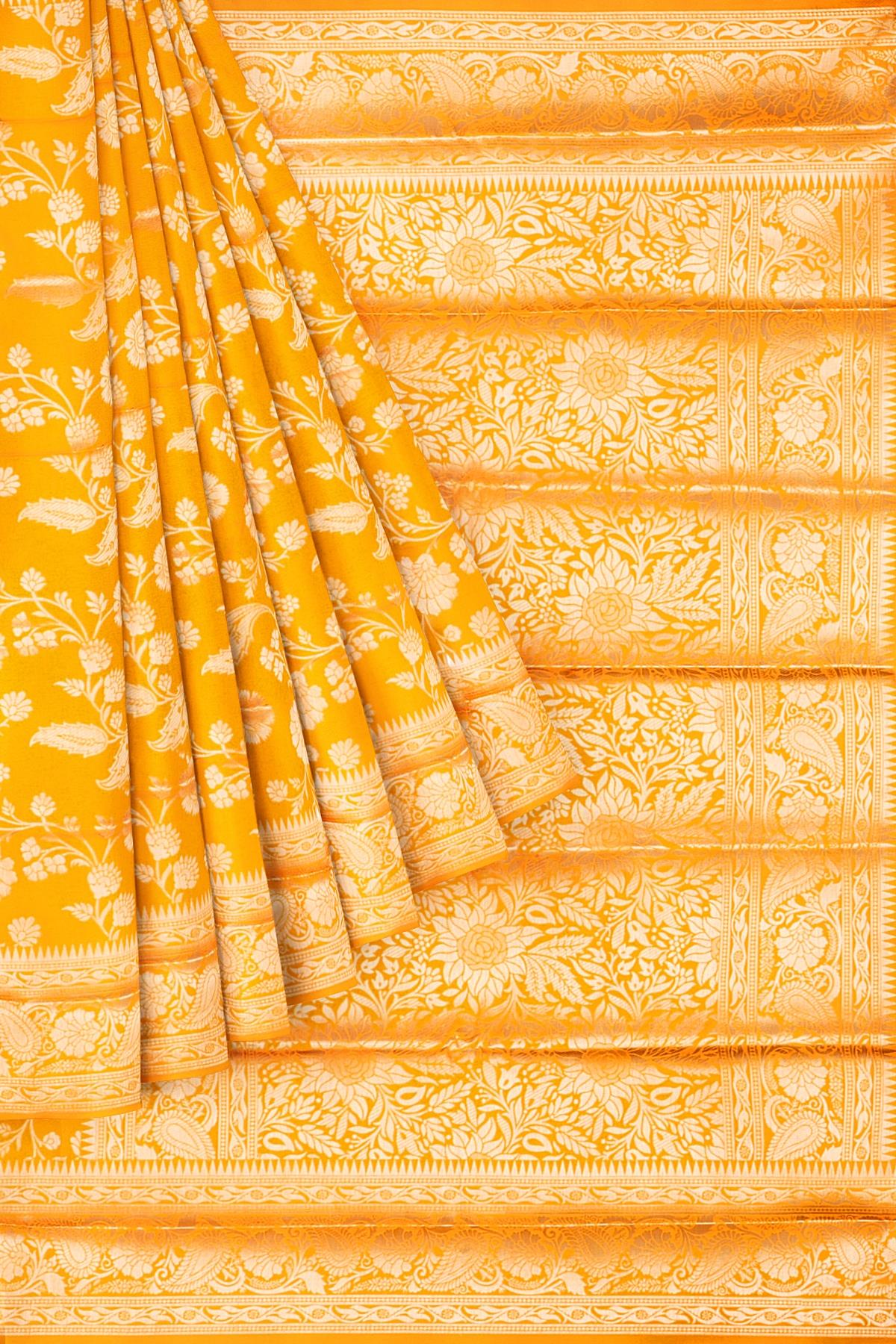 YELLOW and GOLD FLORALS SILK BLEND Saree with SEMI PATTU