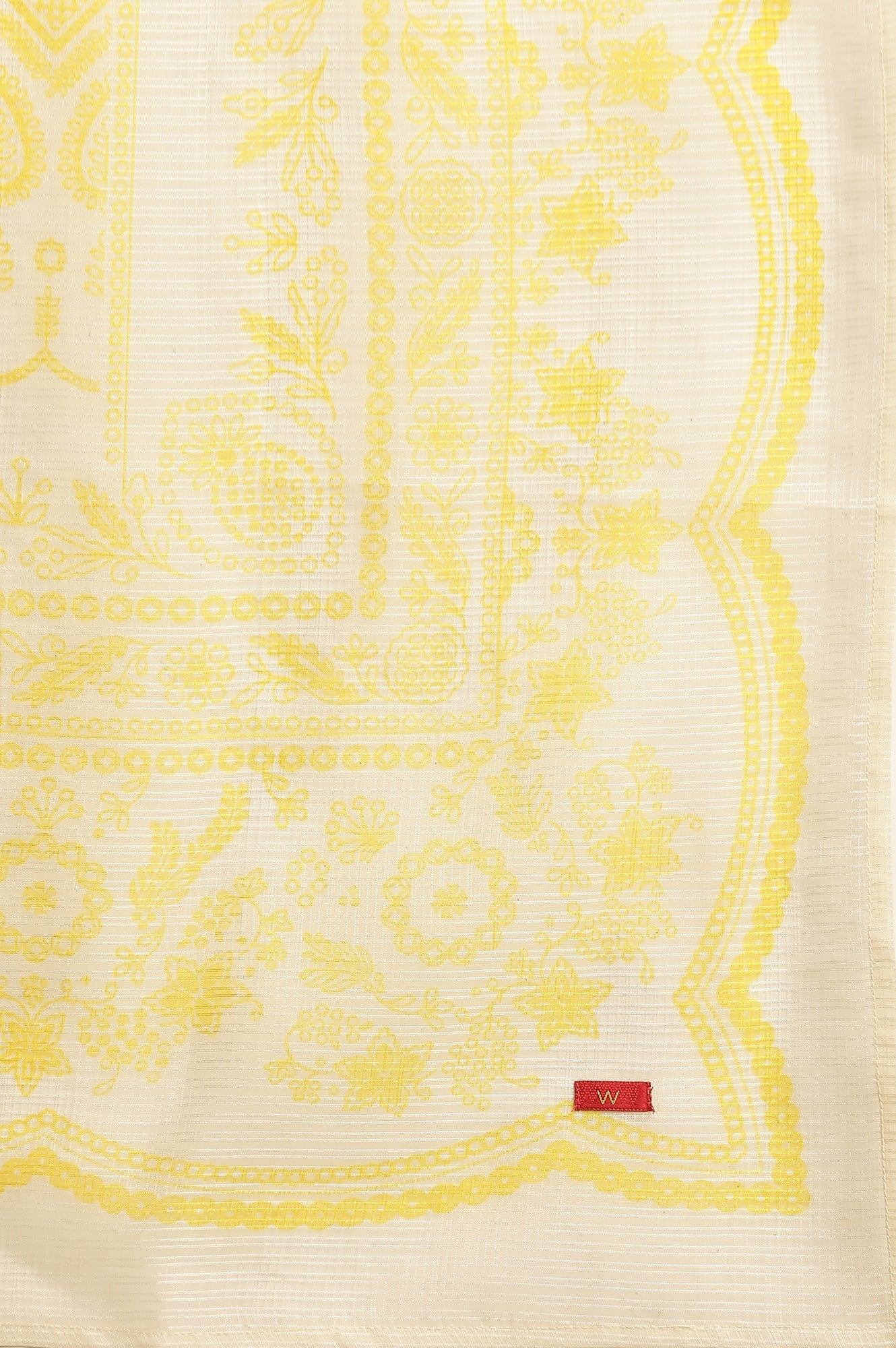 Yellow Printed Straight Kurta With Side Slits Featuring Beautiful Chikankari Embroidery On The Neckline And Dori Tie Up On The Sleeves.The Subtle Floral Print Is Enhanced With Delicate Lace Detailing.The Set Includes A Gathered Sharara In A Coordinating Print And A Printed Kota Drape With Lace Edging.