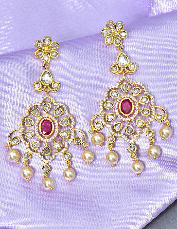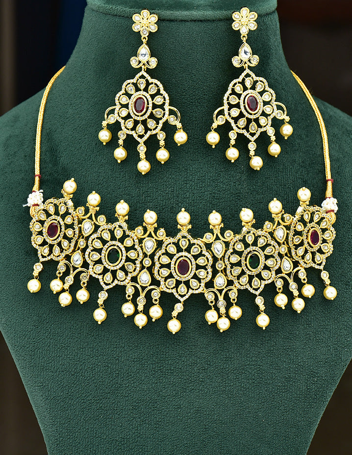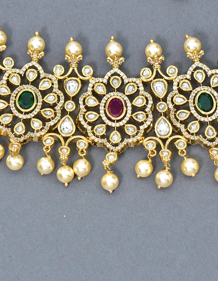 This delicate gold-plated choker, adorned with ruby, emerald, and white stones, is crafted with exceptional metalwork and finesse. Embellished with dazzling American diamonds, it’s perfect for both traditional and fancy occasions, making a bold, eye-catching style statement.